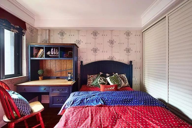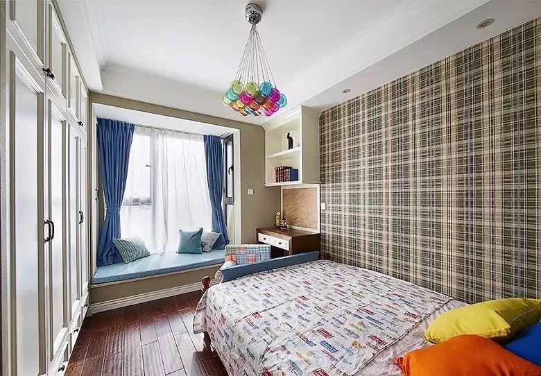 在床与落地窗之间,对窗摆放一个书桌,适合较为宽松的儿童房,若你孩子的房间比较小,就继续往下看。