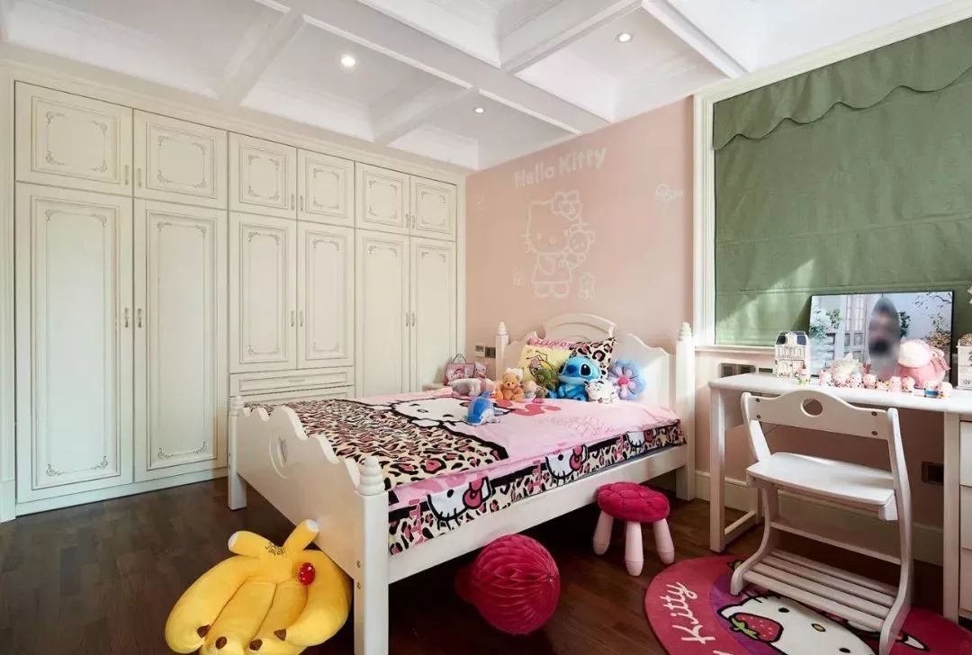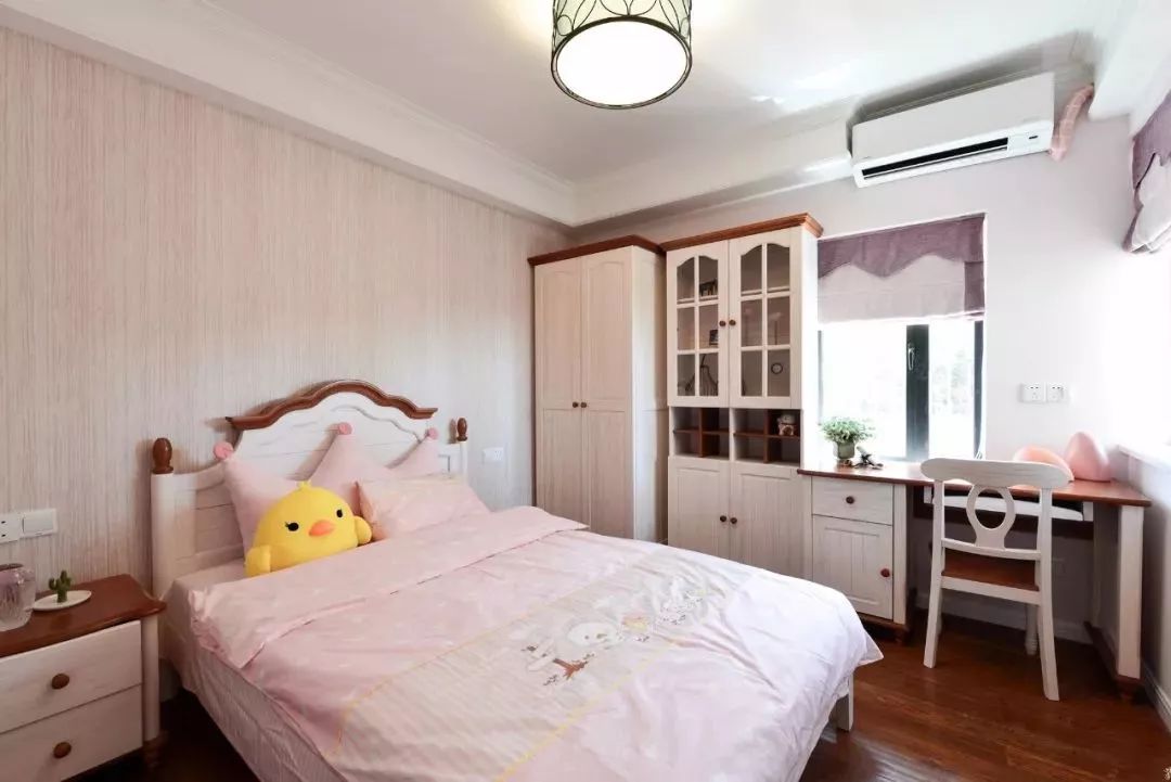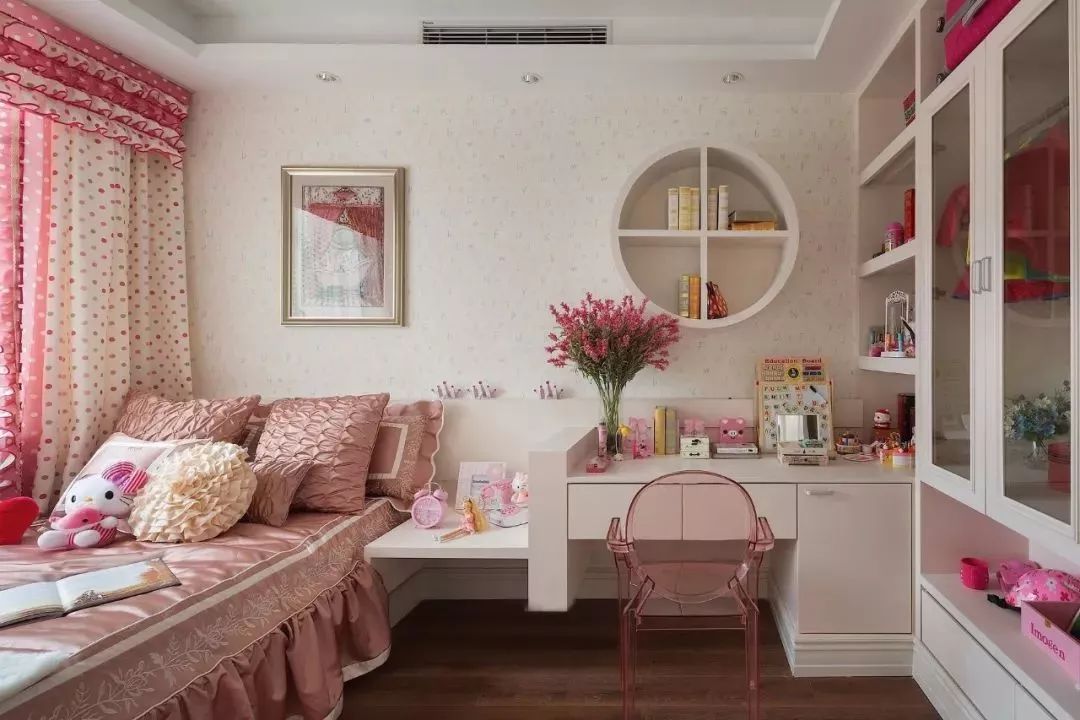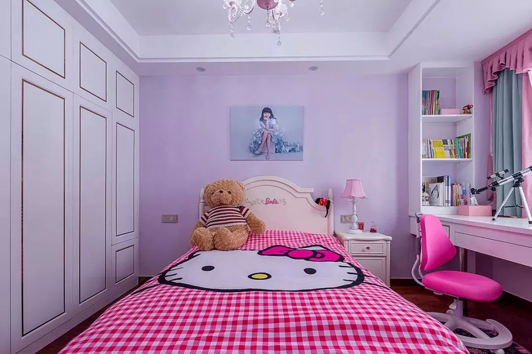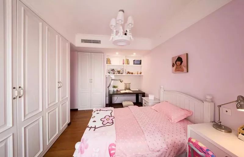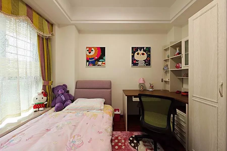 女孩房除了色彩与细节搭配与男孩房不同,在空间利用布局方面是几乎一样的。