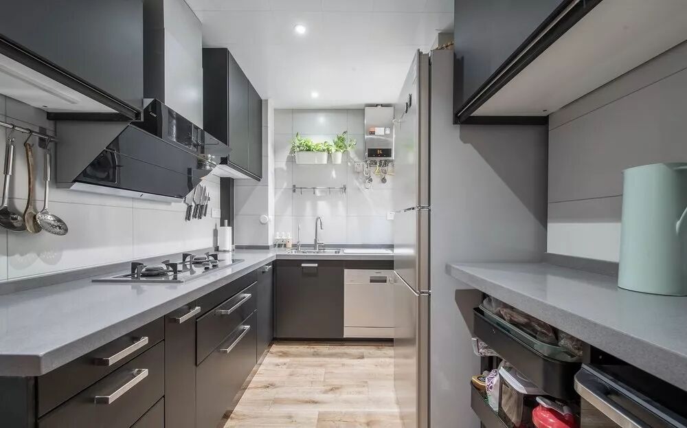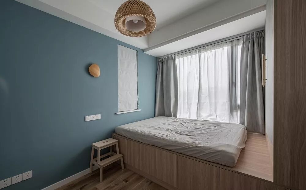 不喜欢清新色调的装修,可以试试高级灰+蓝色,不吊顶+隐形门,规整格局更显宽敞。原来户型阳台很大,把它分成两边,一半收入客厅,一半收入主卧,扩充室内面积。