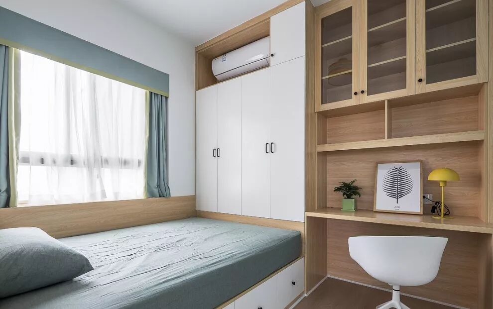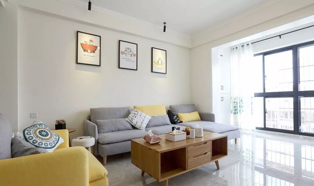 大白墙+活力绿色,灰色+原木色家具,简约的文艺风,不做吊顶,家里方方正正的更加显高,自然而舒适。