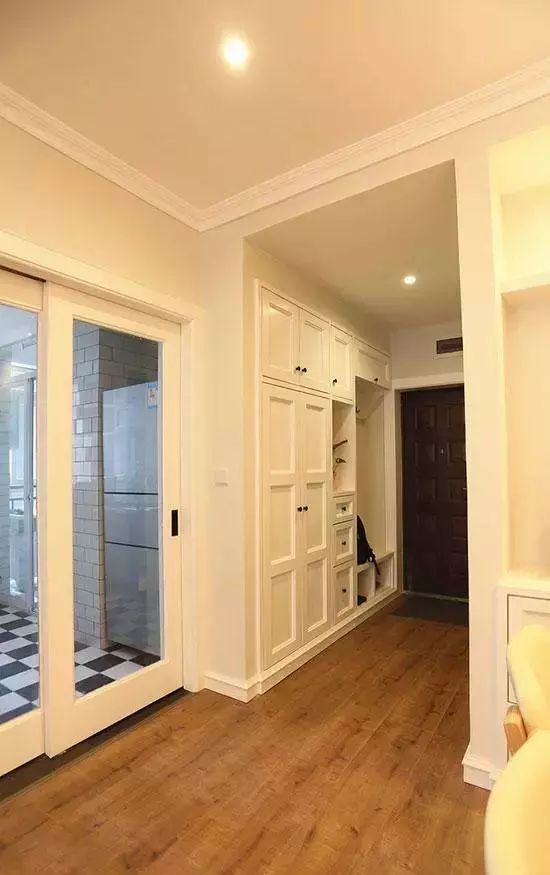 进门玄关是个小走廊,嵌入式的入户柜从款式到实用性都没得说,换鞋凳、挂放区、收纳抽屉一应俱全,进门就被圈粉了。