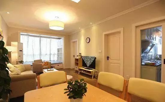 这个客厅布置的简洁宽松,在灯光的渲染下惬意浪漫,小电视柜极其简约,墙上挂钟,既是日常所需又能装饰。