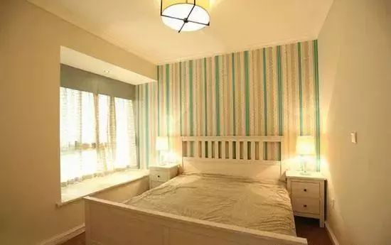 卧室床头背景墙贴了条纹的壁纸,颜色清新淡雅,还带一个小飘窗,主卧空间狭窄,放了床之后基本空间就满了。