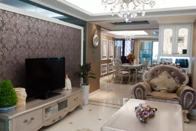 电视背景墙,采用墙纸铺成欧式的典雅空间感。