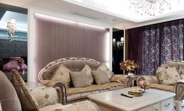 浅紫色沙发墙稍稍内陷搭配灯光形成立体感,客厅紫色窗帘也很搭配。