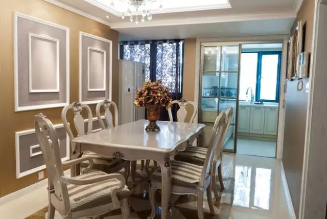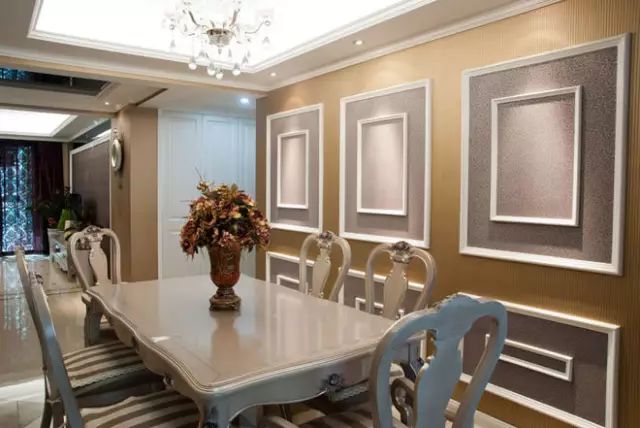 餐厅,暖色系的墙面很是温馨,并采用简洁的石膏线条装饰形成丰富的视觉感受。