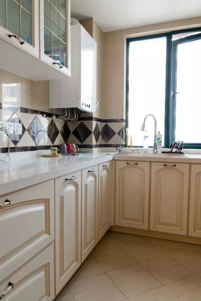 L型厨房,浅色的欧式橱柜,收纳空间多;还有一面大大的窗户,采光非常好,明亮又整洁。