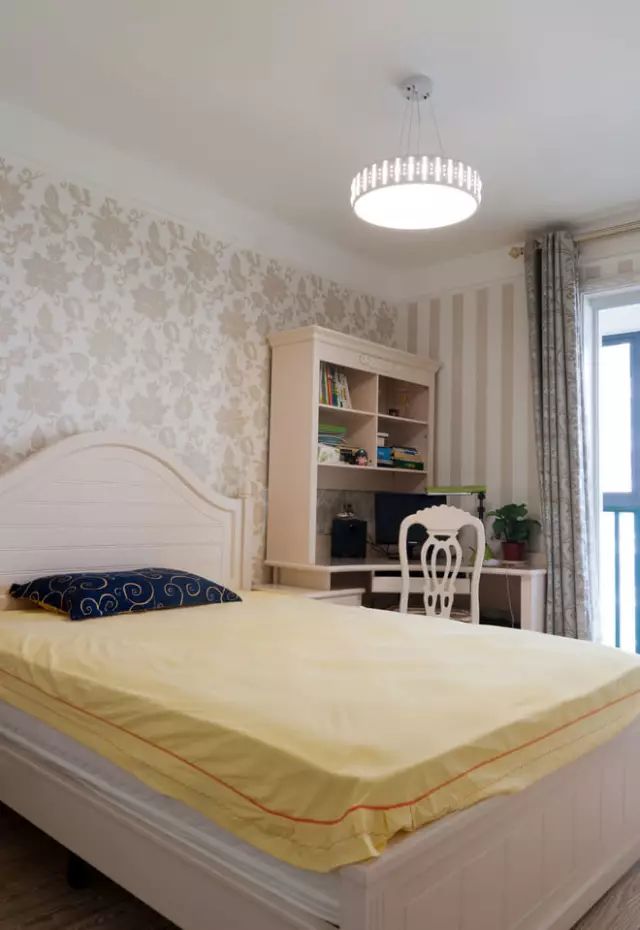 儿童房简小舒适,墙角买了一个一体式桌柜,也很方便孩子学习。