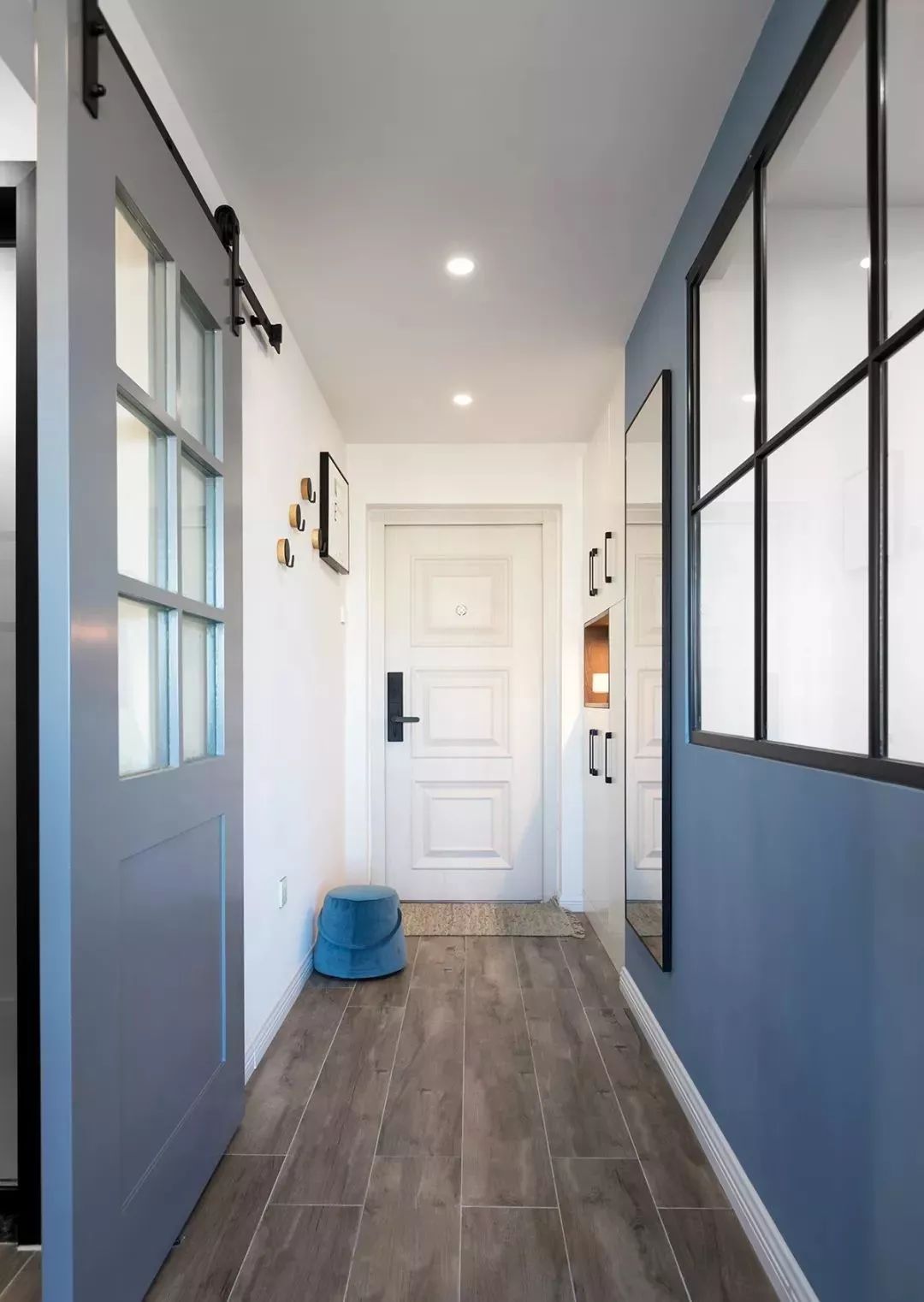 关注微信公众号:jiasjmt 一起学习更多装修技巧与案例!想要免费设计和了解更多装修知识,就点我吧!今天推荐的是一套面积仅为68平米的一居室小户型,为满足一家三口的居住需求,将一居改造成两居。根据业主的喜好,将风格定为现代风,色彩上,合理的加入了一些蓝色元素,让整个空间更有腔调。| 玄关 |