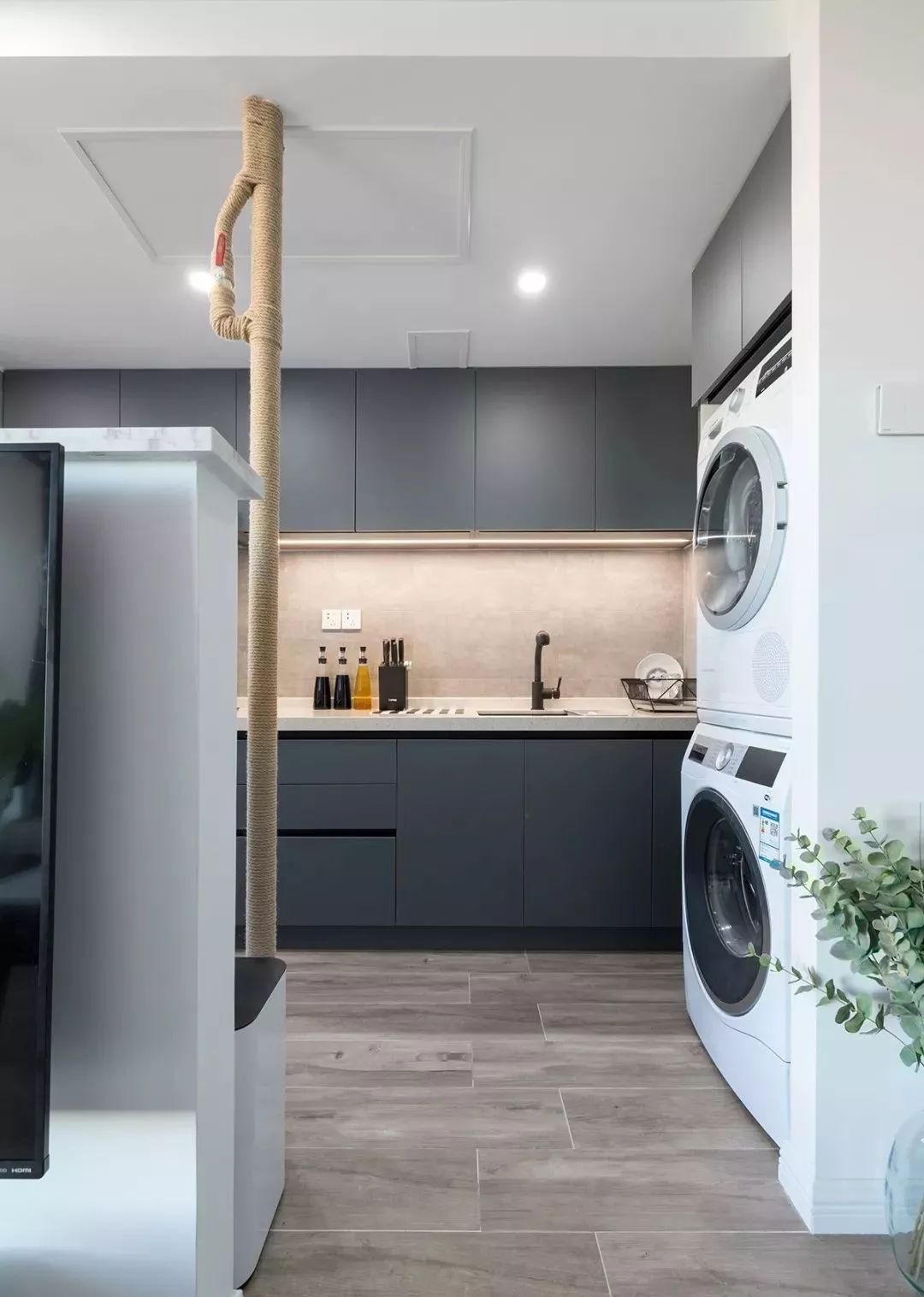 电视柜背面做了个小型吧台,平时小两口和孩子吃饭,空间完全够用。把洗衣机跟烘干机全部融进厨房里,空间利得非常充分,一点也不浪费。