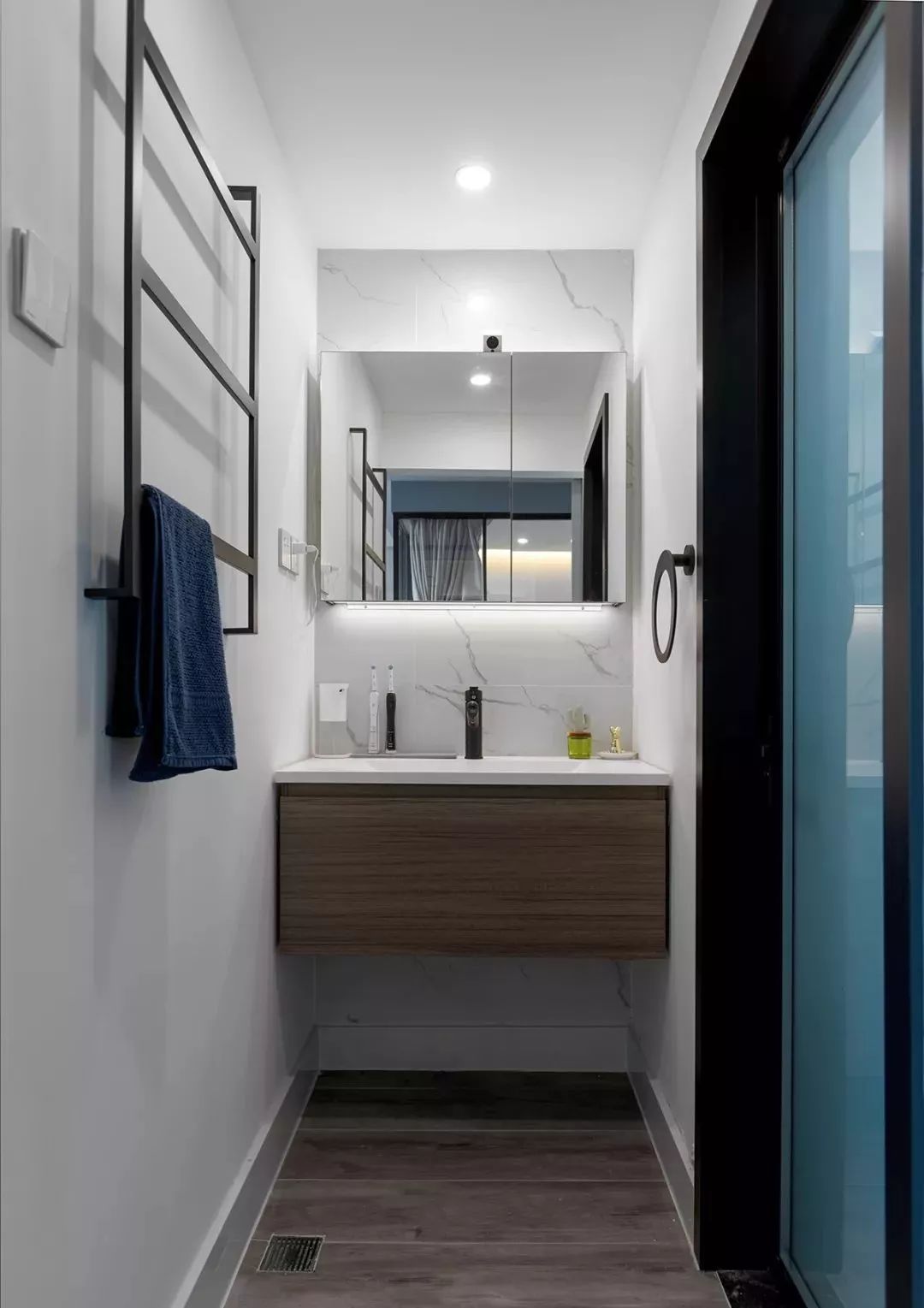 进门右手边就是卫生间,一扇蓝色谷仓门与玄关过道相隔。推开谷仓门就是洗手台,实现卫生间干湿分离。