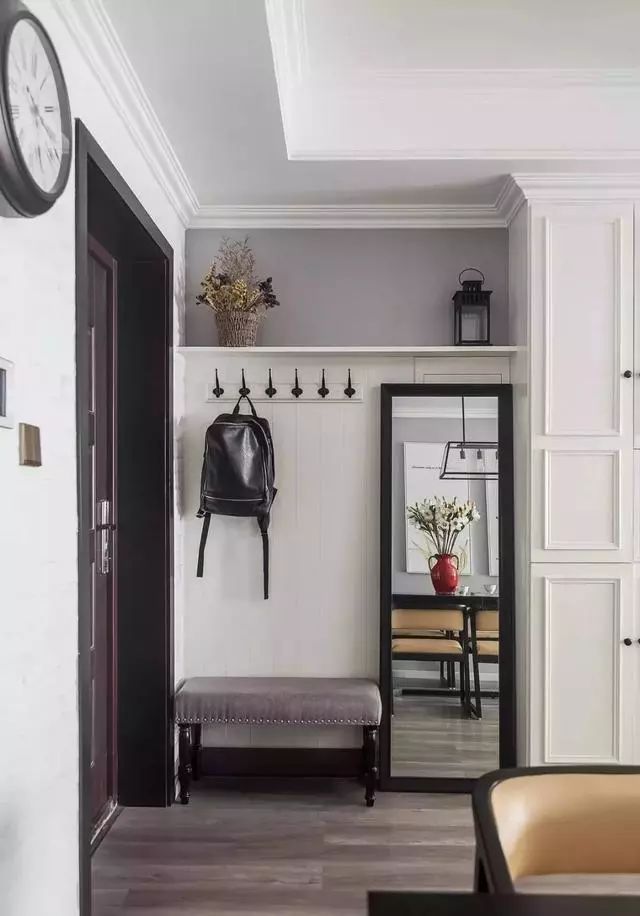 入户护墙板与层板的设计,充满简约美式格调,既美观又实用。