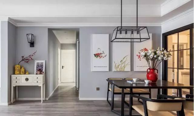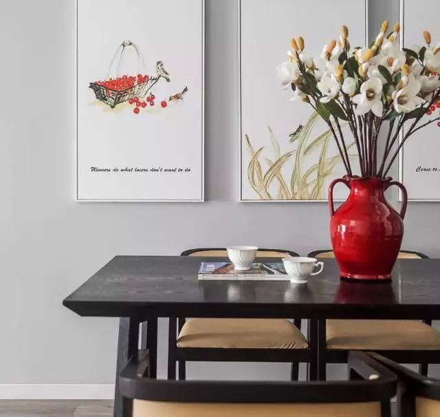 黑色实木餐桌,卡其色餐椅,搭配铁件吊灯,红色花瓶呼应装饰画,提亮色调。