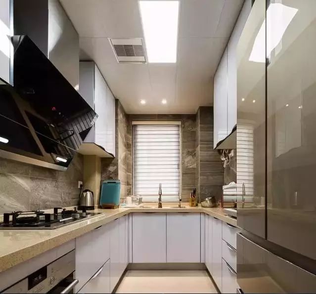 厨房地面铺设砂岩哑光地砖,墙面铺贴仿石纹墙砖,白色橱柜搭配米黄色台面更加耐脏,U型厨房让原本不大的空间变得功能齐全。