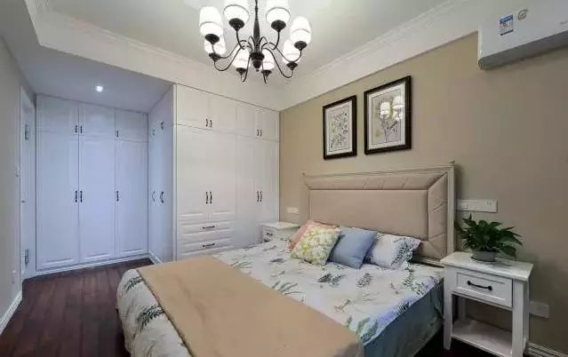主卧通铺深色地板,搭配奶咖色墙面,两幅植物装饰画点缀,质朴的实木软包大床,大面积的木作衣柜,让房间具有强大的收纳功能。