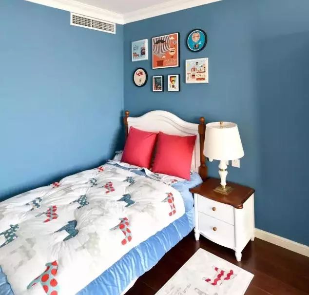 儿童房地面通铺深色地板,蓝色的乳胶漆墙面,床头用不同形状与大小的装饰画点缀,整体活泼的氛围,小美式的床与床头柜搭配小马床品,红色的靠枕整体了温馨的气氛。