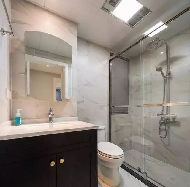 卫生间的地面和墙面全都铺贴仿石纹哑光砖,玻璃移门让卫生间干湿分区,木工制作的洗脸台盆柜,定制的黑色柜门,设计简约实用。
