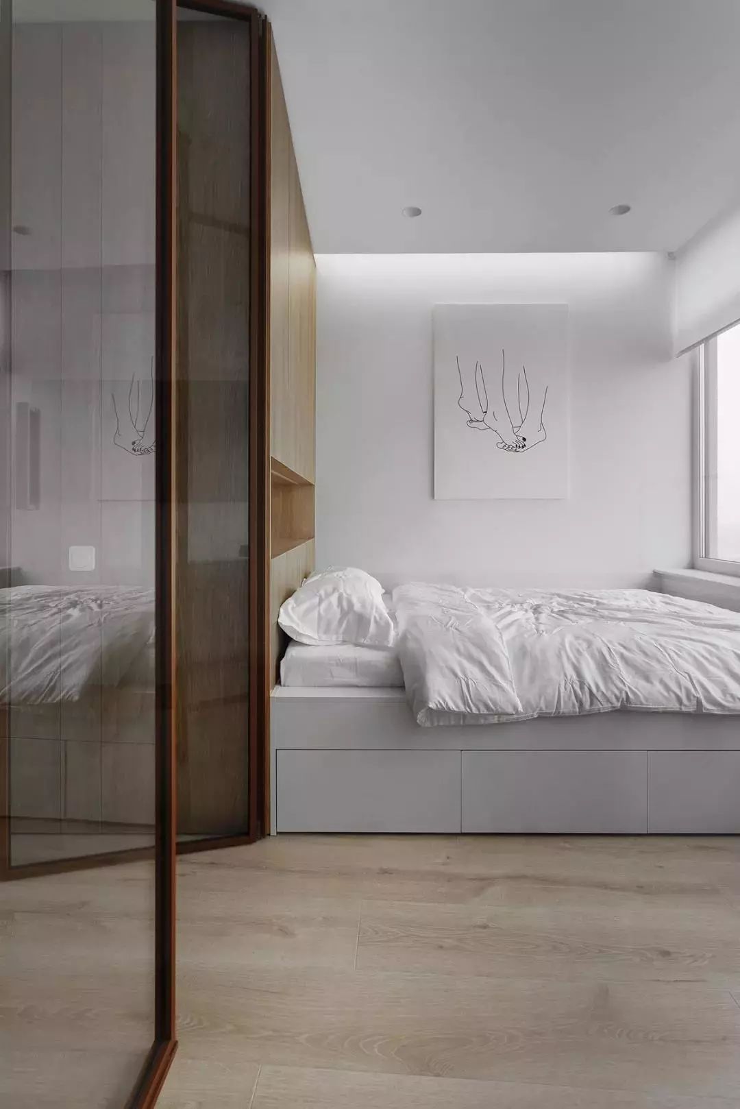 从入户门走进这个家,就可以看到中岛厨房和餐厅的结合、简洁的白色背景墙上挂着电视,卧室和客厅之间用玻璃门作为隔断。