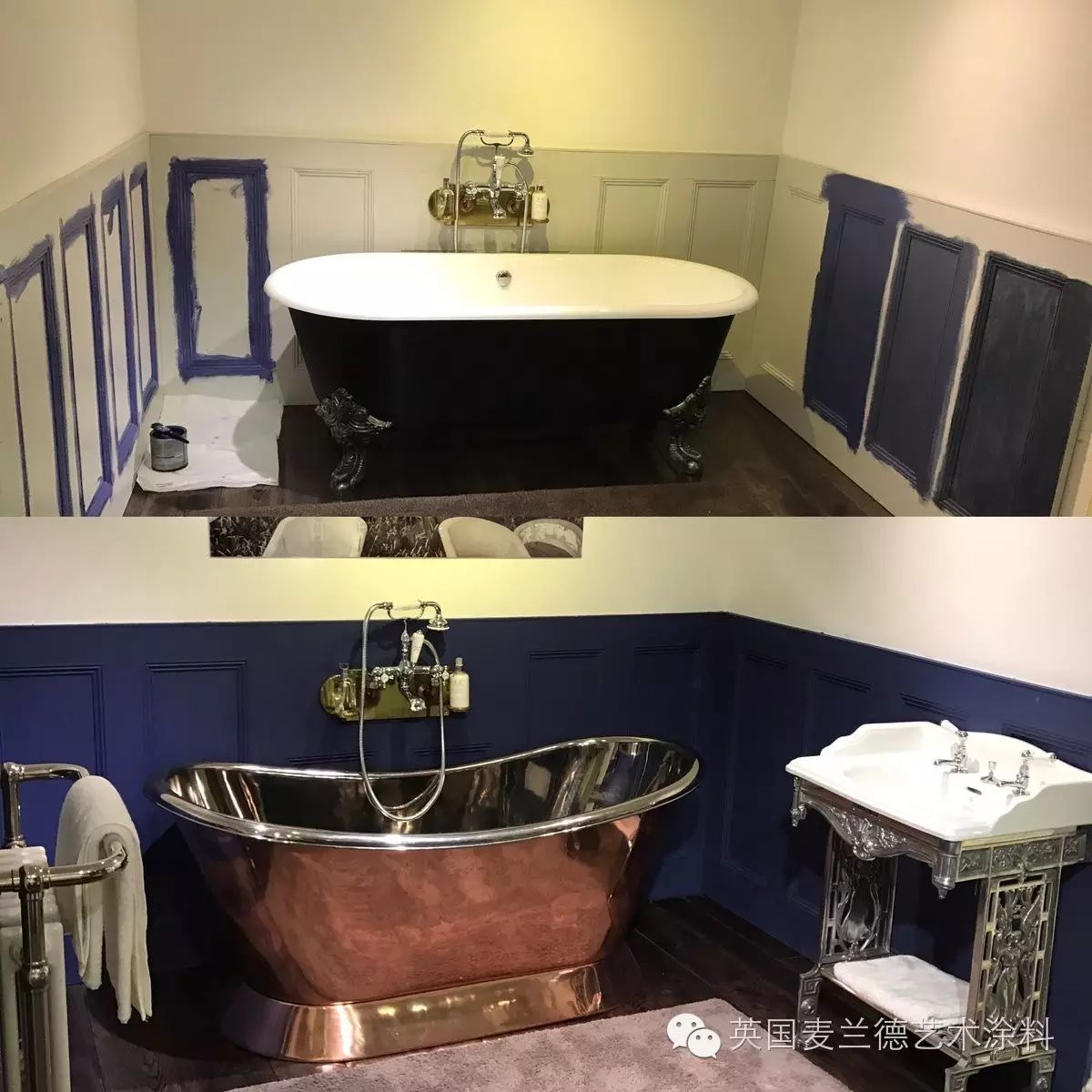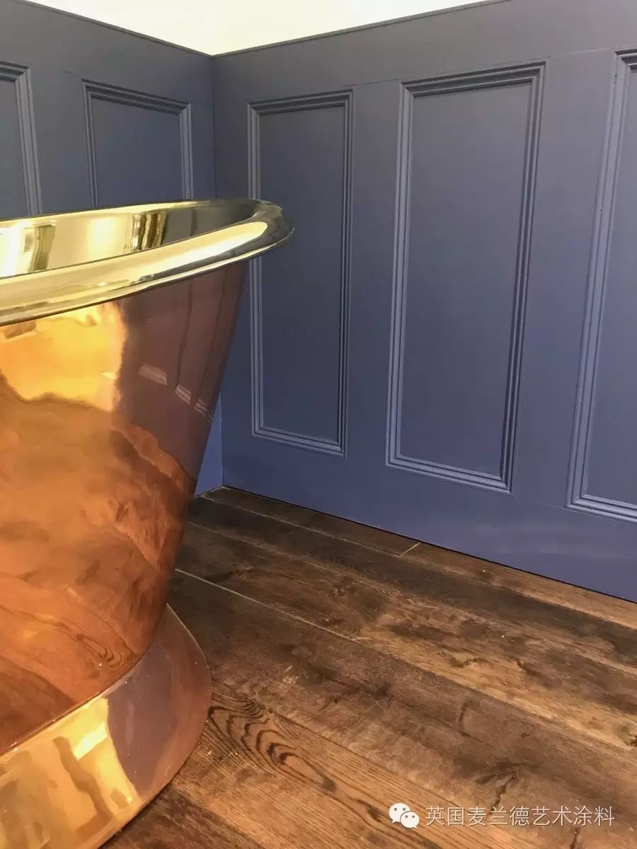Mylands的涂料产品可以完美应用于浴室、洗手间等场所,定制的色彩为您带来美轮美奂的效果。**地板及墙壁涂刷使用“Bond Street No.219”, **镶板涂刷使用“Maritime No.236”**浴缸涂刷使用“Rose Theatre No.249”**墙壁涂刷使用“Charter