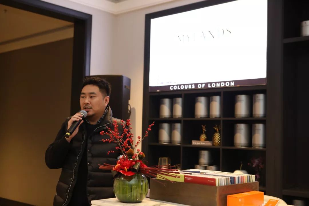麦兰德中国区总经理:Tony Yu 在活动现场对品牌进行精彩宣讲,并将品牌文化与产品特色相结合,使在场每一位嘉宾置身于麦兰德的色彩世界里。他表示,Mylands麦兰德于1884年创立于伦敦的Lambeth ,是英国最古老的生产涂料和抛光剂的家族企业品牌,经过四代人的传承,至今仍由创始家族拥有并管理着,且仅在英国伦敦进行生产制造。