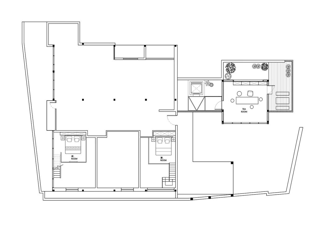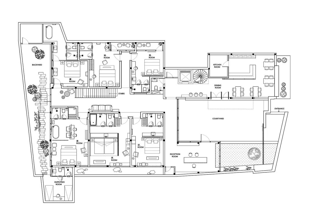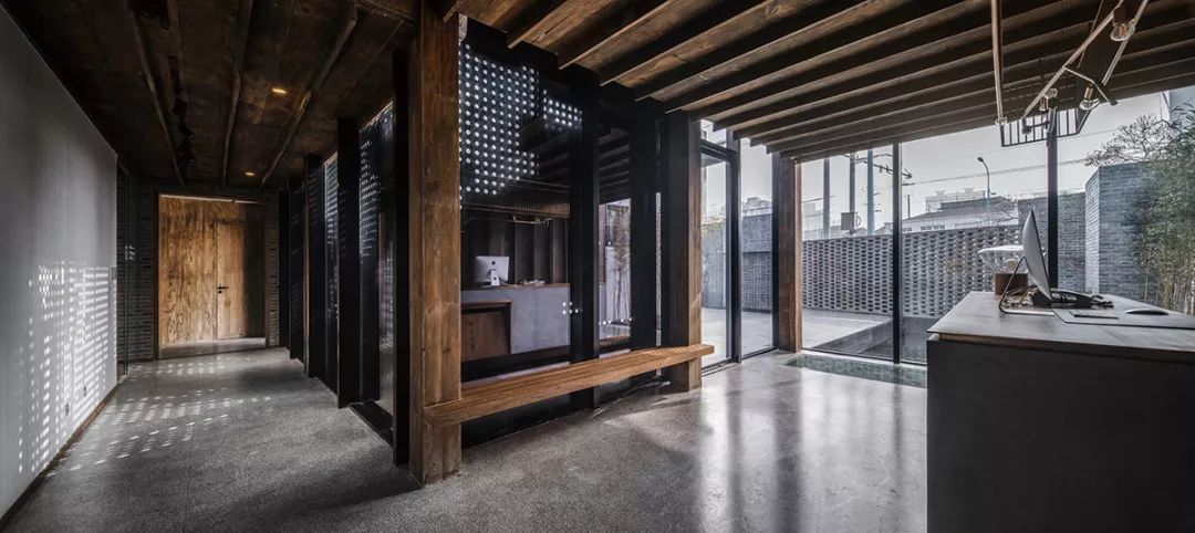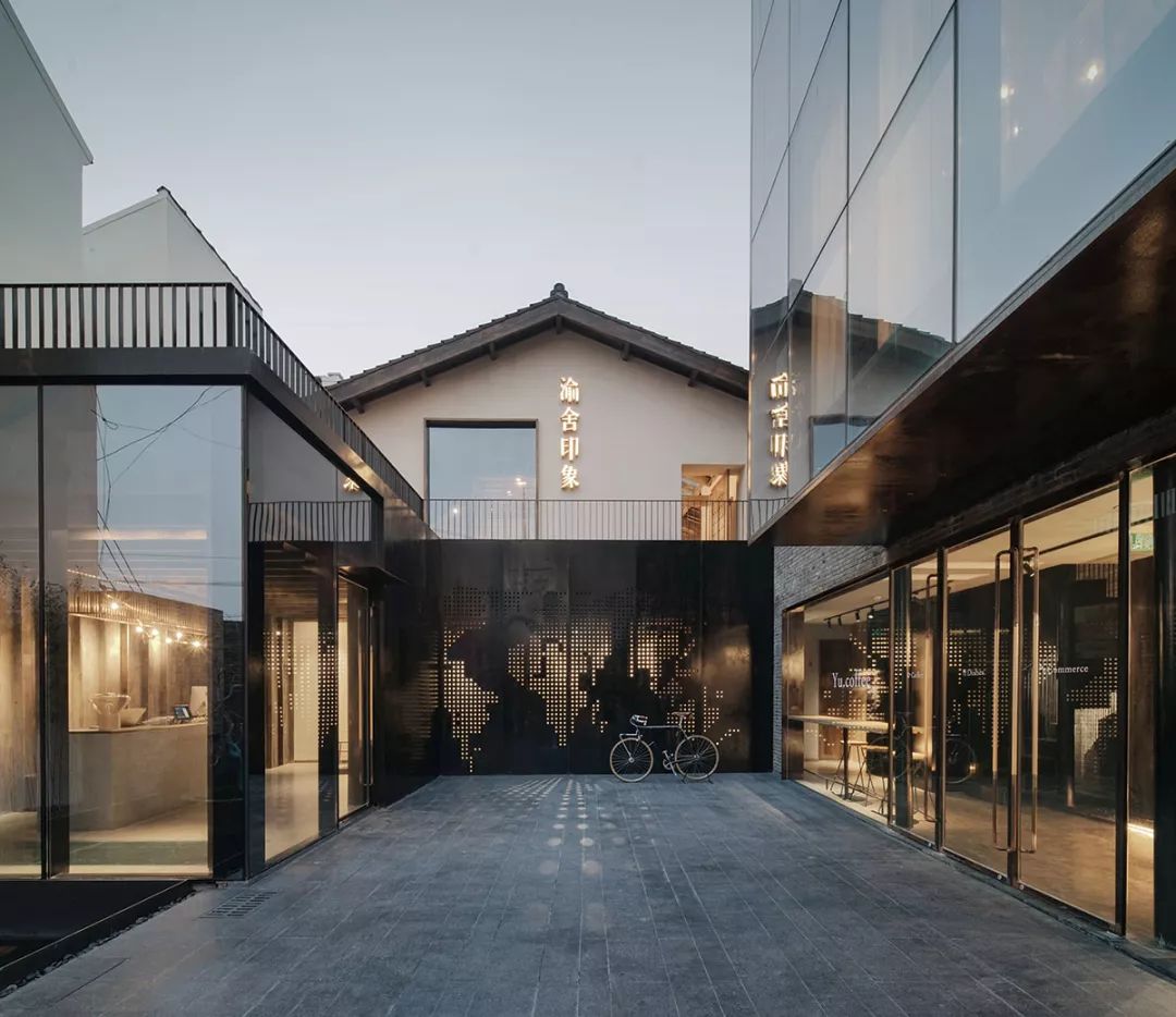 改造后的渝舍印象由两栋楼组成,设计过程从整合的角度梳理了文化、自然、建筑之间的关系。以入口处以折叠巡回的青砖引入,为空间的公共与私密提供了过渡。参考北方的四合院和上海小院的特点,设计师大刀阔斧,在寸土寸金的上海市中心辟出一处院落,解决了建筑间的孤立状态,使客房、前厅大堂和咖啡厅视觉上遥相呼应,院落的引入集中体现了传统建筑的造园思想。