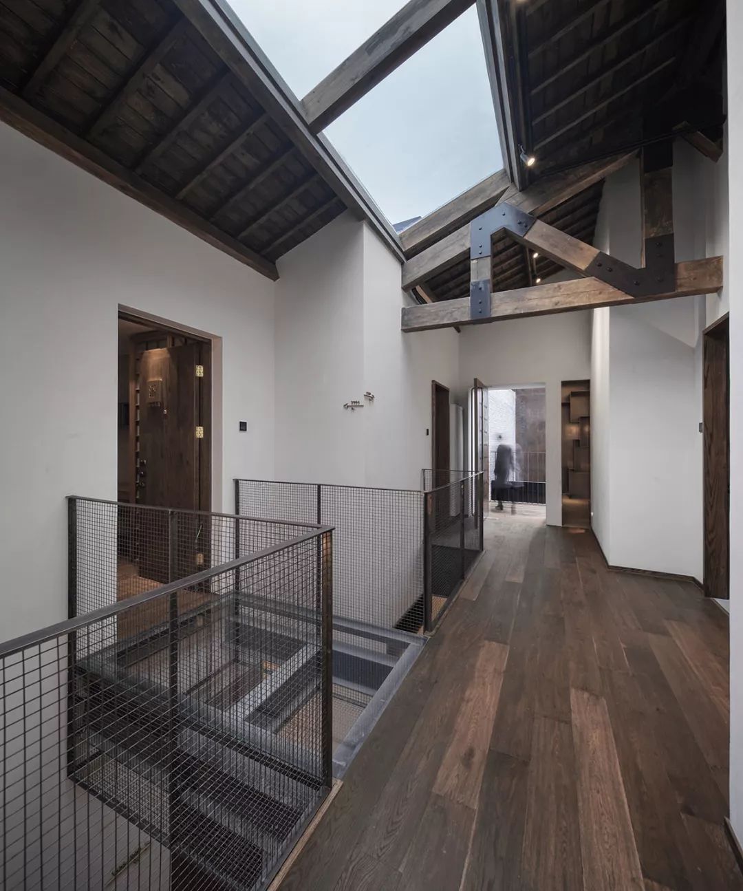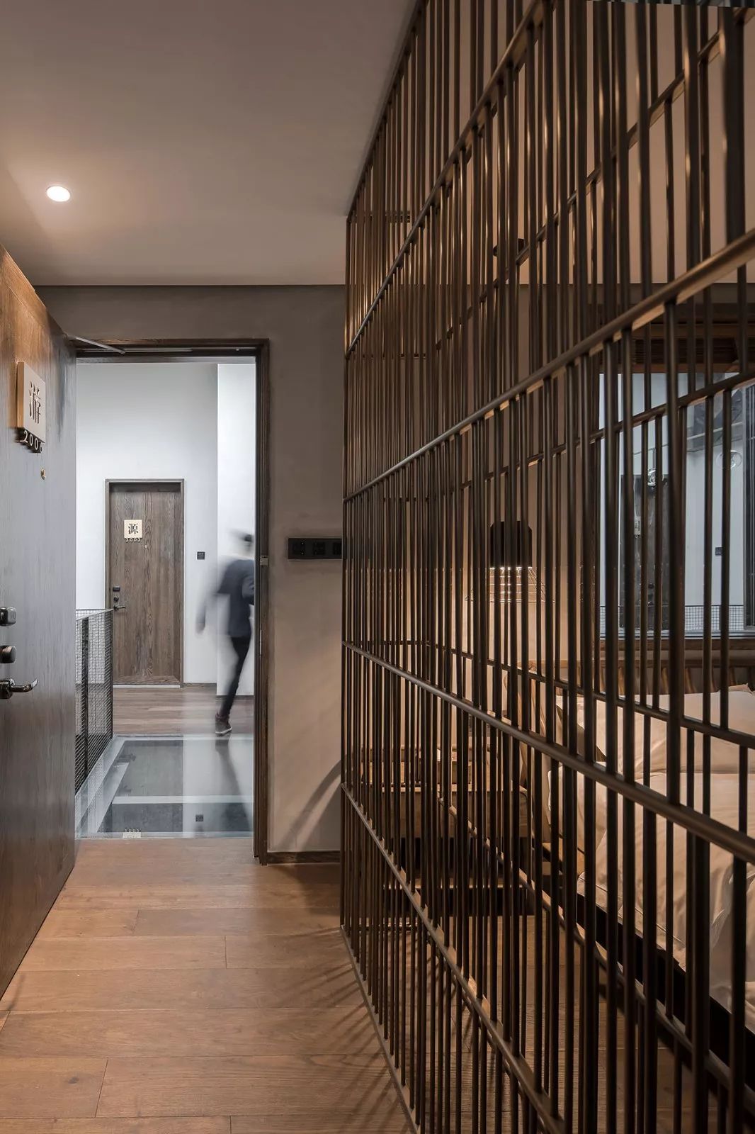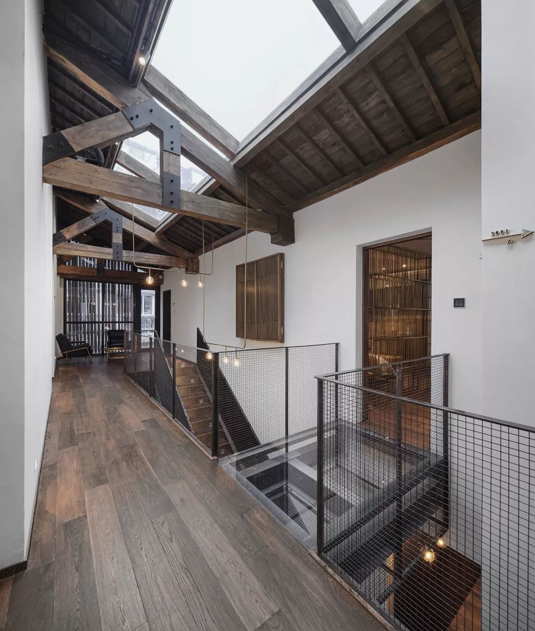 民宿客房在朝南的主楼,楼内空间功能分区布局巧妙,恰到好处。中庭,将楼道空间与露台以及后院全部打通,达到视线与空间的最大程度的开放。玻璃天窗保证了客房公共区域的采光需求,一改老旧房屋的昏暗,铜质和实木相结合的楼梯承上启下。阳光照进天窗,辗转映射在二楼白墙,透过挑空的中庭玻璃栈道照射到一楼水磨石地面,整个空间一气呵成,显得更加充沛明亮。