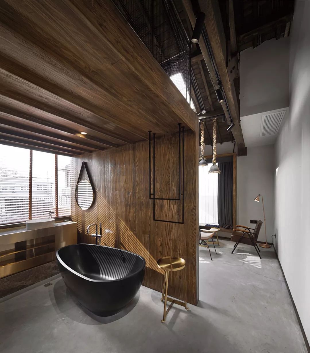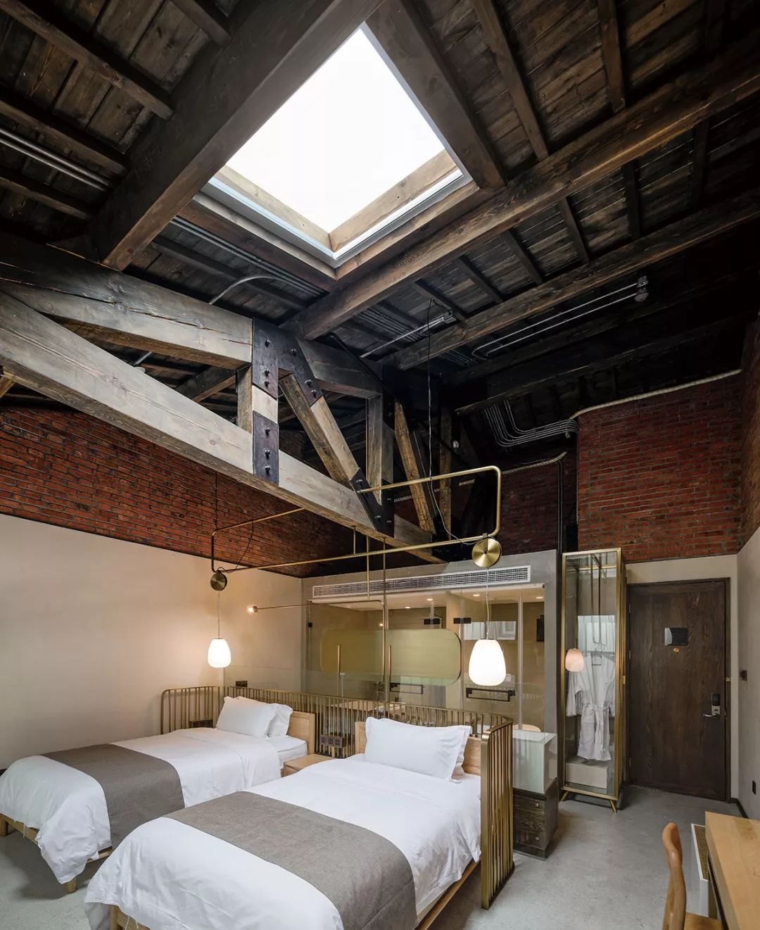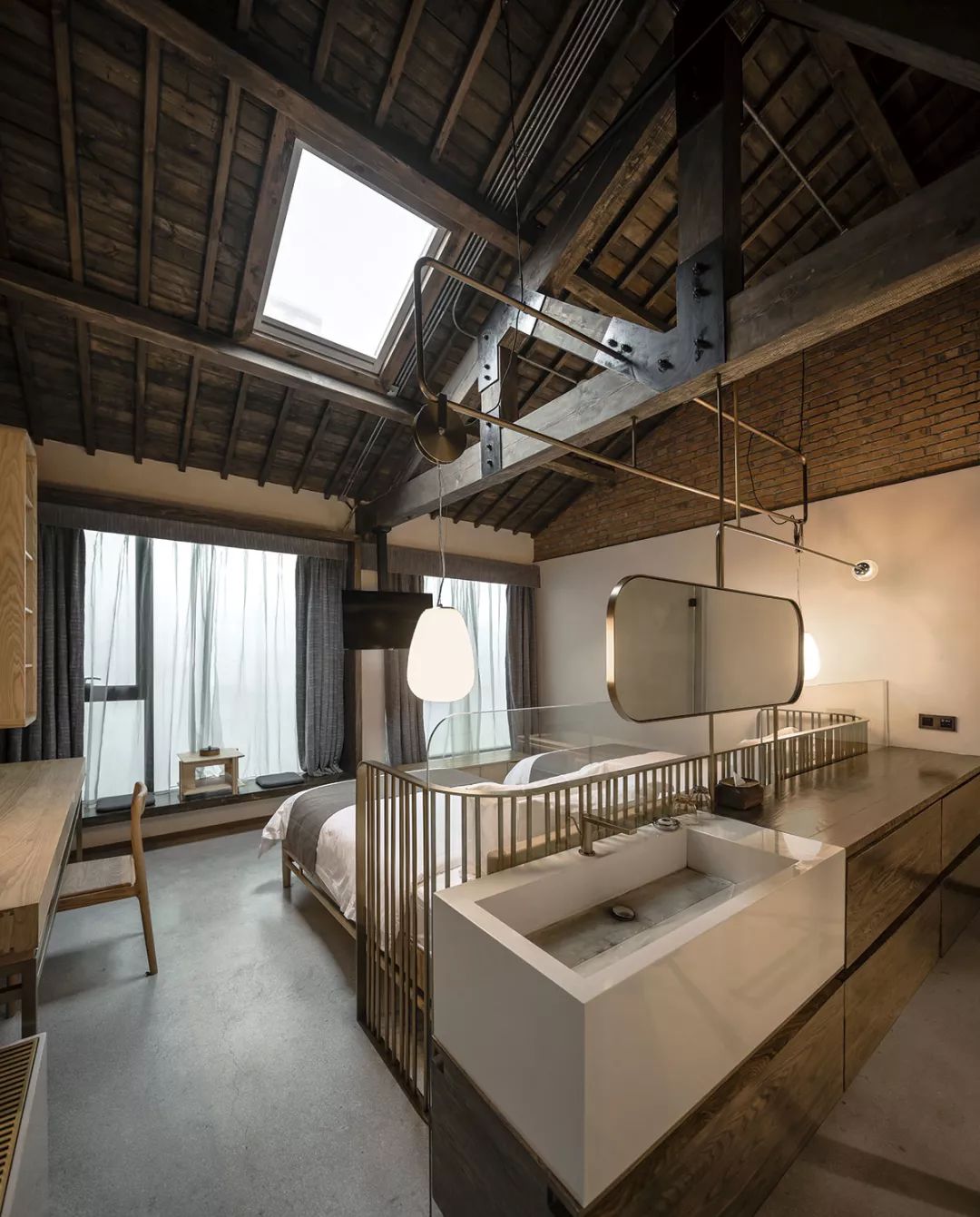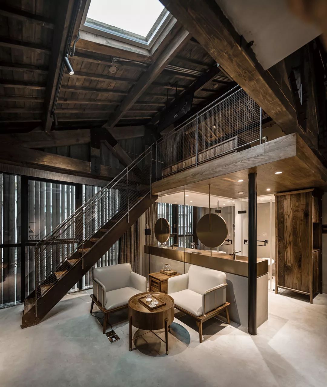 渝舍印象共打造了两个loft大跃层房间,以作为城市民宿的刚需与亮点,分别取名“润”“澜”。房间面积55平方米,利用高处做二层,一层则有足够的空间做配套设施:开放式洗浴空间、休闲会客区等。楼上是休息区域,将工作休闲与休息区分开,保证了客人的私密性。楼顶的一扇电动斜顶天窗,提供广阔清晰的视野,白天采光深度大而均匀,夜晚躺在床上仿佛身处一座天空之城,伸手即够得到天上的星星。