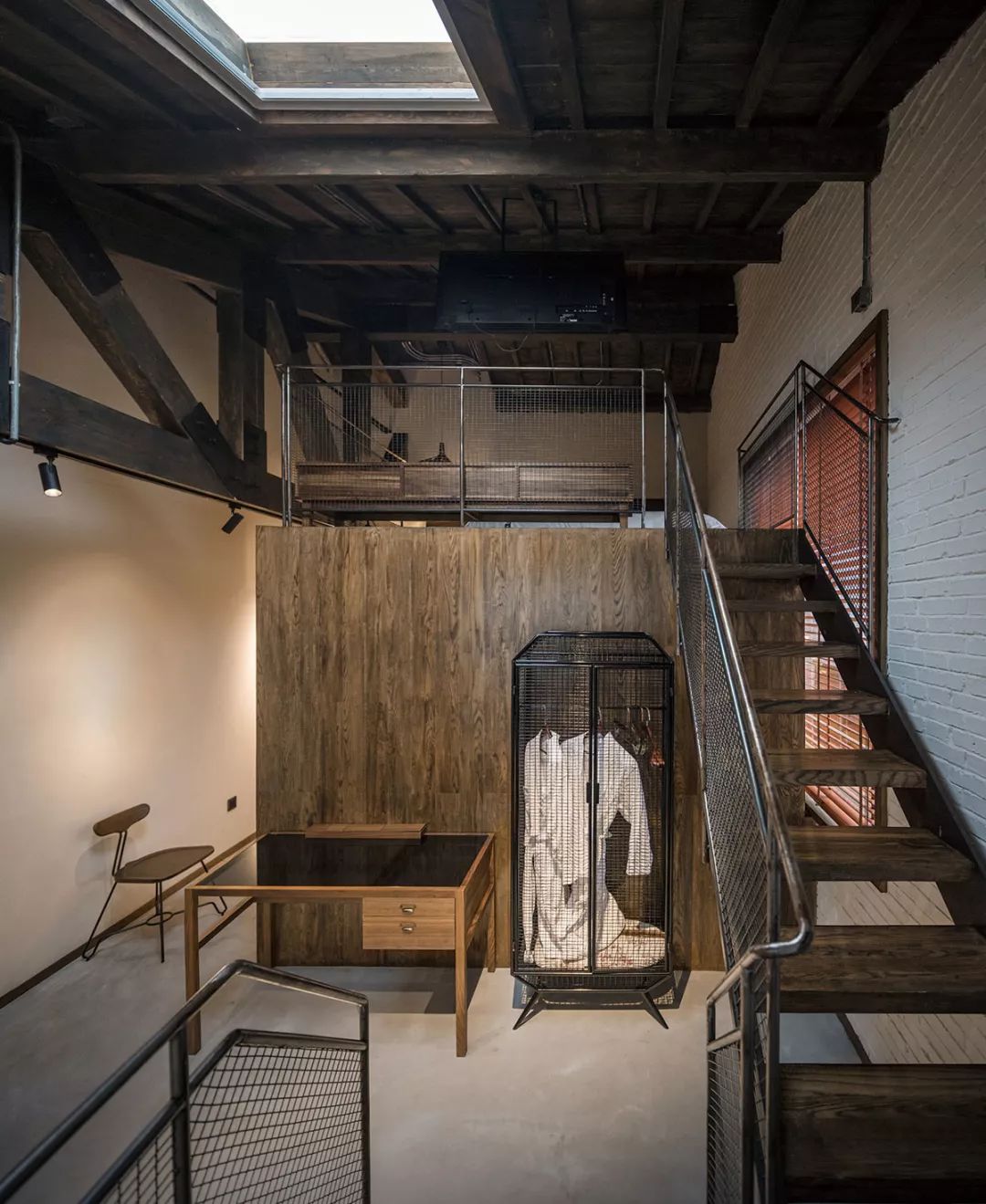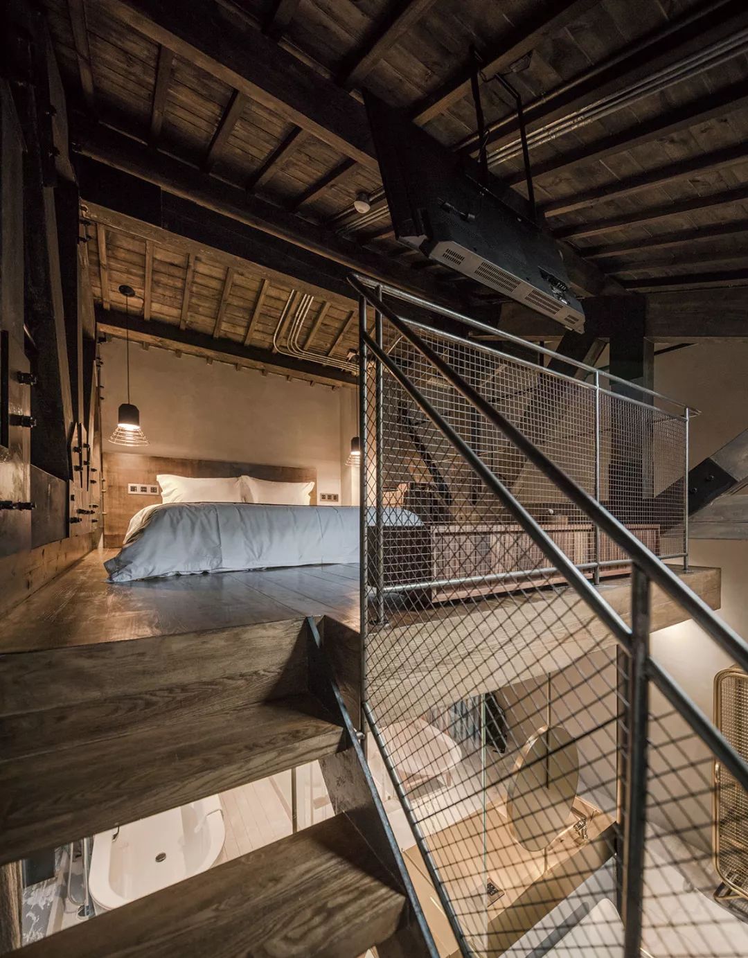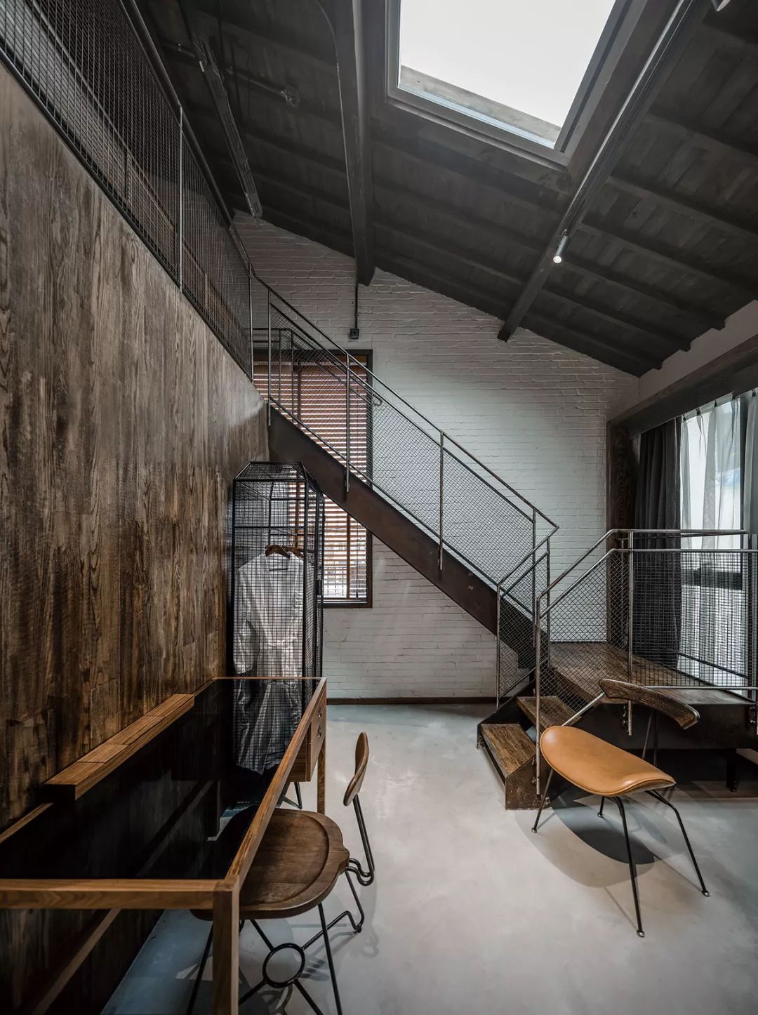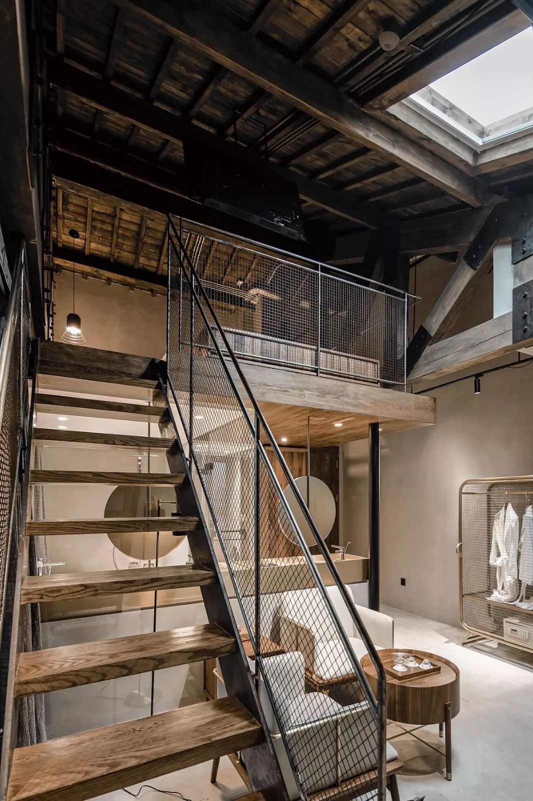 渝舍印象共打造了两个loft大跃层房间,以作为城市民宿的刚需与亮点,分别取名“润”“澜”。房间面积55平方米,利用高处做二层,一层则有足够的空间做配套设施:开放式洗浴空间、休闲会客区等。楼上是休息区域,将工作休闲与休息区分开,保证了客人的私密性。楼顶的一扇电动斜顶天窗,提供广阔清晰的视野,白天采光深度大而均匀,夜晚躺在床上仿佛身处一座天空之城,伸手即够得到天上的星星。