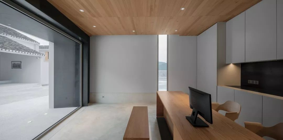 一层北端会议室的西墙采用了磨砂U型玻璃,这种磨砂颗粒肌理在建筑外立面上与细腻的外墙涂料和刷白的粗糙砖墙在对比中形成统一, 从室内看不仅玻璃表面粗糙感与东面的拉毛水泥墙呼应 而且也增添了一些朦胧感。U型玻璃外隐约可以看到通向二楼茶室的楼梯。会议室的北面是落地大玻璃窗,东墙有节制地只开了一个窗,这样将人的视线有目的性地引向了北面的开阔山景和山景衬托下的建筑。 此栋建筑在型体,体量和室内外材料的运用上尽可能地保持着抽象和简洁。