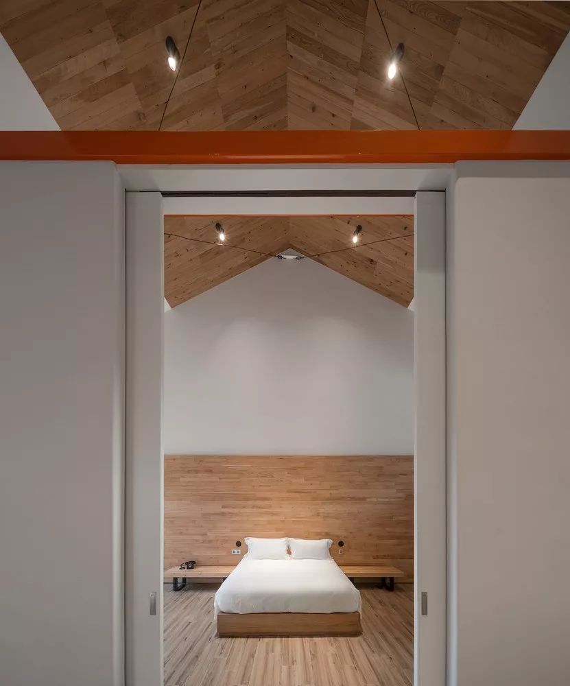 粮仓过大尺度的室内空间本身是个不宜用来居住的空间,我们通过“盒体”嵌套的方式来化解室内单一性, 这些赋予了实用功能“盒体”满足了酒店客房功能上的要求,并通过对尺度的调节来唤起人的身体在空间中的知觉性。 这种形式改变了通常用隔墙来区分空间的方式,增加了空间的丰富性和具体性。在室内的材料的运用上,设计师保持了一贯的朴素自然的风格, 实木板,素面水泥,槽钢,乳胶漆,冷轧钢板有序结合使用, 营造出了室内平静温馨的氛围。