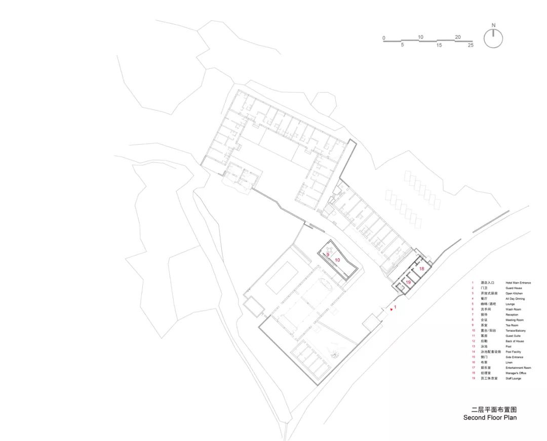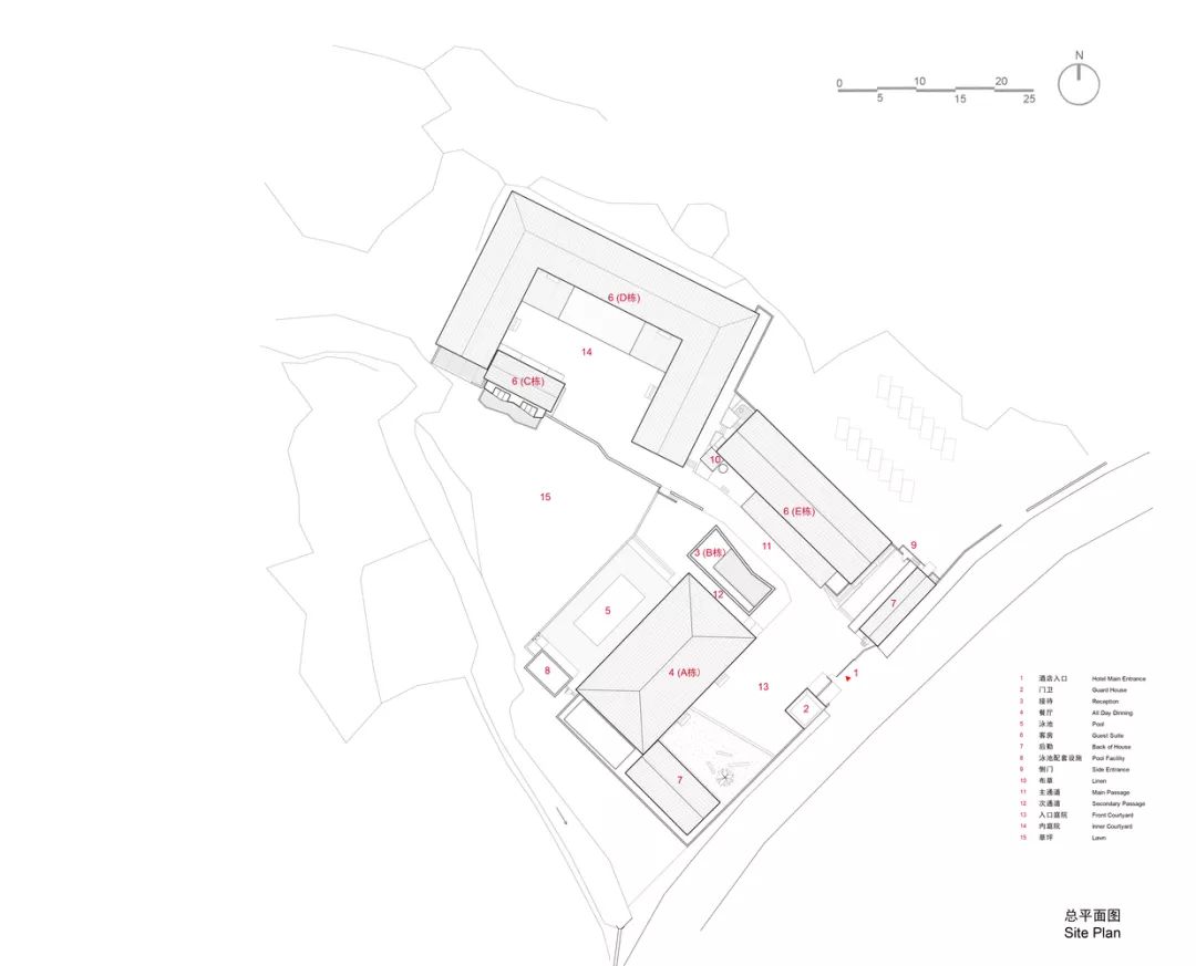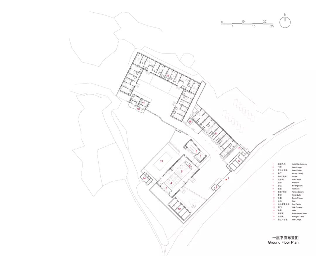 原场地由一条4.5米宽的主通道连接前后两个庭院及围绕着庭院的7栋老房,改造中设计师在尊重现有建筑肌理的前提下, 调整和梳理空间格局, 首先是拆除了正对酒店入口大门的一栋二层高的砖房,这栋原始建筑阻隔着前后空间并阻挡了视线, 在其占地范围内新建的是一栋局部二层高的建筑, 并在其西(西南)侧增加了一条3米宽的次通道, 加强了前后场地在视觉上以及动线上的连贯性。其次是拆除了主通道与西侧草地之间的围墙, 使建筑与整个场地及周围的山景融合更密切。在功能分布上,酒店的公共及辅助设施被安排在临近入口庭院的几栋老建筑中,新建建筑西侧的一栋老建筑改造后作为酒店的全日制餐厅, 餐厅北面是新增加的泳池,泳池面向视野开阔的草地和远处的山。设计师通过疏导.围合的手法, 使场地的动线更流畅,空间组合疏密相间,让人在不同尺度的空间中游走体验。