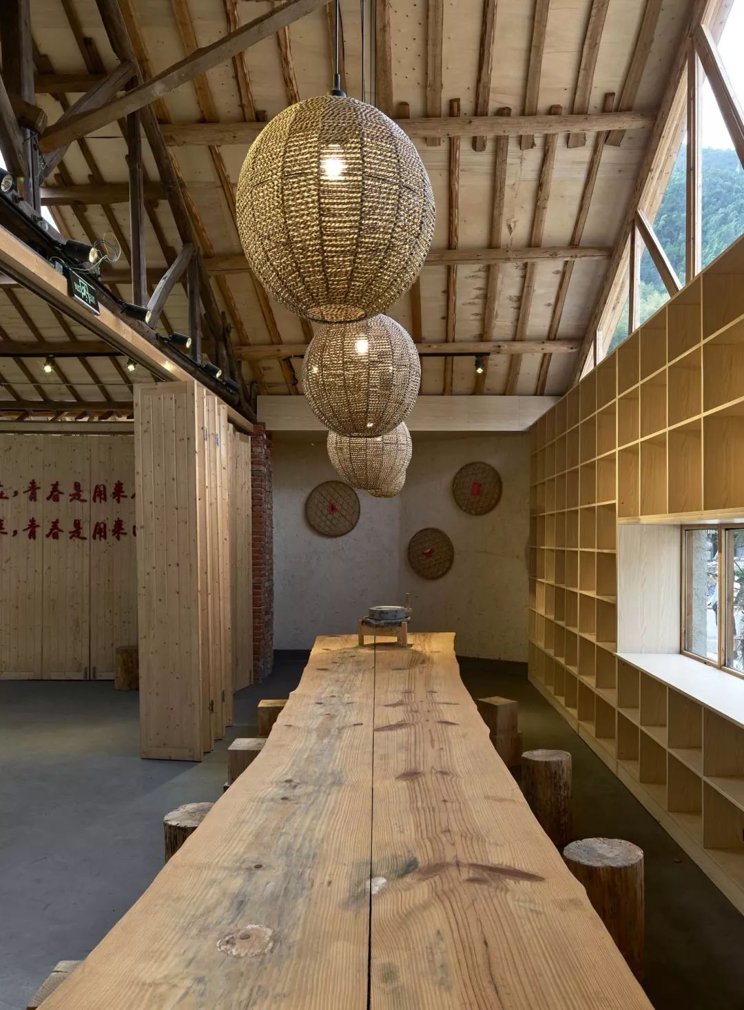 内部空间朴素自然,墙面内外一致,地面则用水泥做磨光处理,屋顶则是保留了原始木屋架的结构美感,软装也以原木为主,使建筑、室内融为一体。