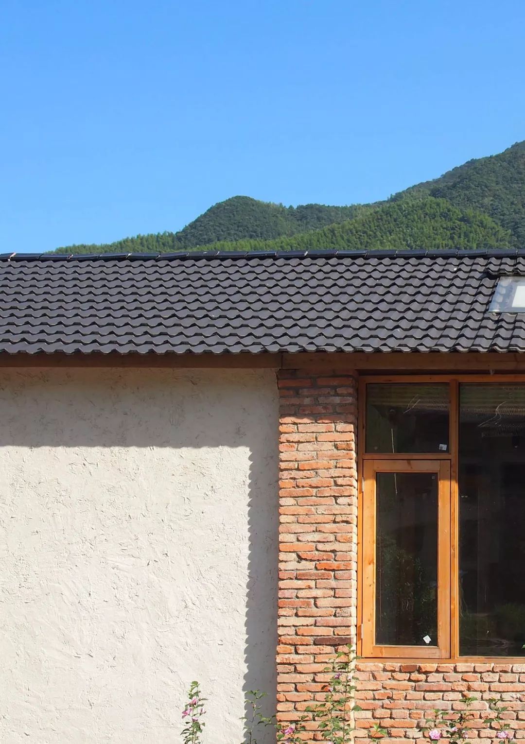 为了避免相互干扰,与农居的相邻界面不开或尽量少开窗户,临马路墙面1.3米以上才开大窗,坐在里面可不受道路干扰,但依然能看到对面的山水景色。