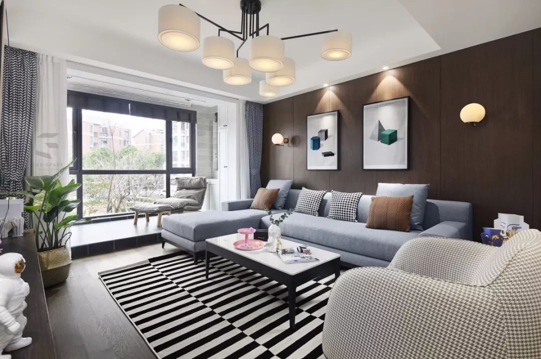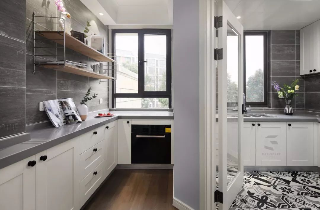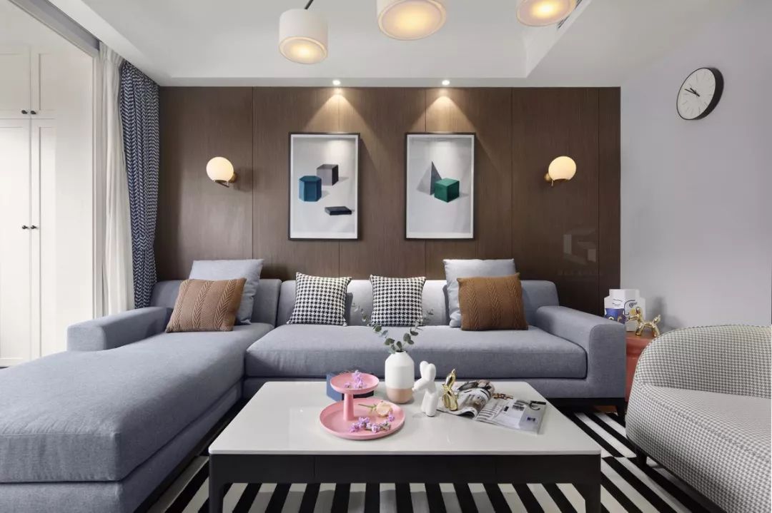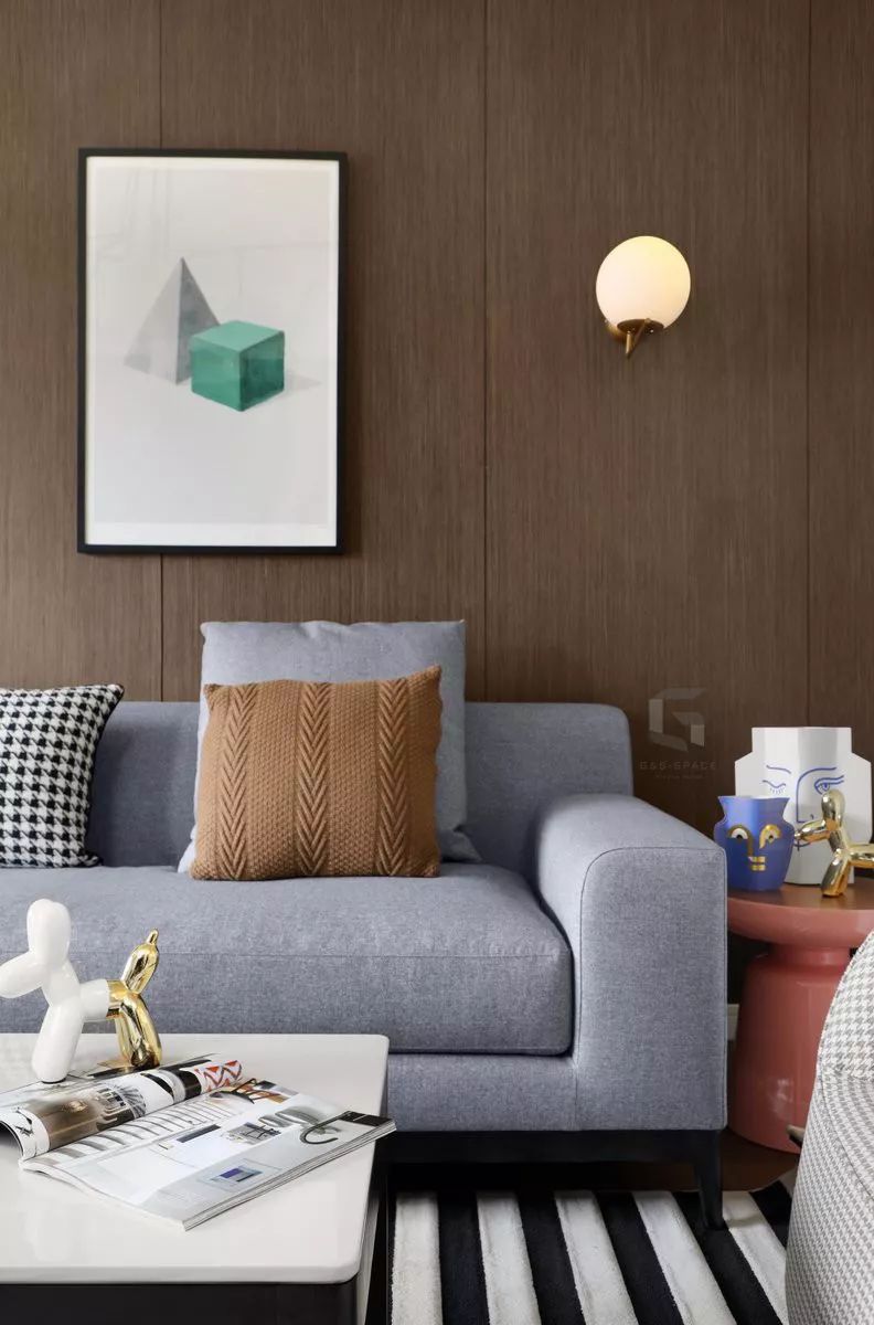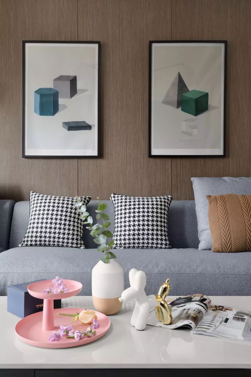 房屋是在二楼,所以如何处理的明亮宽敞是空间格局的重点,业主是一位年轻独居的优雅女士,具有时尚独特的生活品味。个性亲和,生活习惯较宅,希望疲劳的一天工作回到家后可以是一个愉悦放松适合独处的居家环境,不想要复杂的装饰,却对空间的材质有着细节的要求。因此整体空间上我们打开了阳台和客厅的隔阂,让两个空间互相融合,最大化使采光可以进入到室内,餐厅也用了休闲卡座的形势使空间更加自然,丰富了餐厅区域用餐以外的功能,厨房区域采用中西分离,满足日常烘培冷餐的需求。冰箱也改到外部空间使中厨更加宽敞。对于材质和颜色上,大面积用灰色奠定,增加大块面咖色直纹木饰面材质作为空间中的温暖材质。辅以质感纹理壁纸带来饱满细节,整体色调用灰色系压住空间感。软装细节上增加精致点缀,黑白千鸟格图案、粉色小边几、金色小摆件都为整个房屋增加了有趣的味道和亮点。