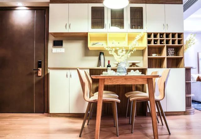 餐厅采用开放式设计,以木色和白色作为主要基调,辅以跳跃的黄色,高冷的硬装与活泼的软装相得益彰令人沉醉。