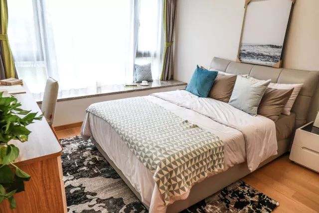 卧室里清透的白,跳跃的蓝,还有那悠悠的绿,仿佛身处山中的松林。远风走过这片绿色,掀起一阵阵如浪潮般的盛景,静心聆听那簌簌作响的自然之声,心生宁定与欢喜。