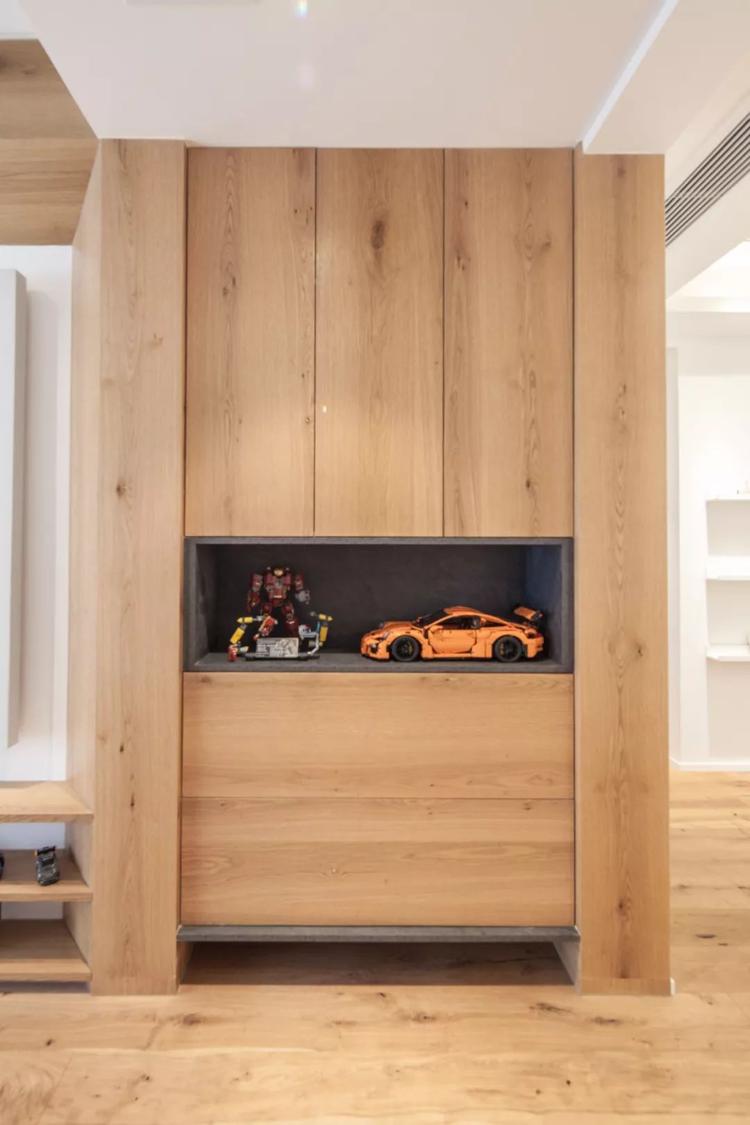 入户门位于房子的中间,设计师在入户门的对面做上原木风的鞋柜,鞋柜的中间和底部都选择了留空,中间摆放的机器人和车都是屋主所喜爱的。