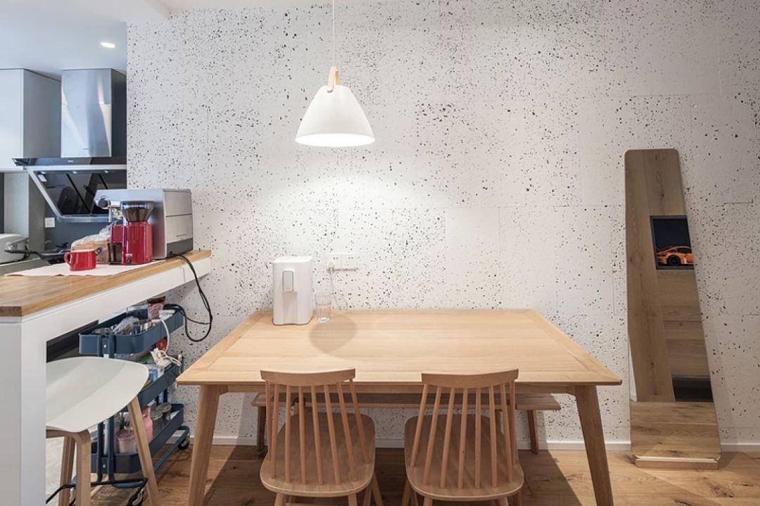 位于入户门另一侧的就是餐厅空间,餐桌椅边上是一个小吧台。餐厅的墙面选择了非常有设计感的洞石墙,给这个空间带来了别致的美感。