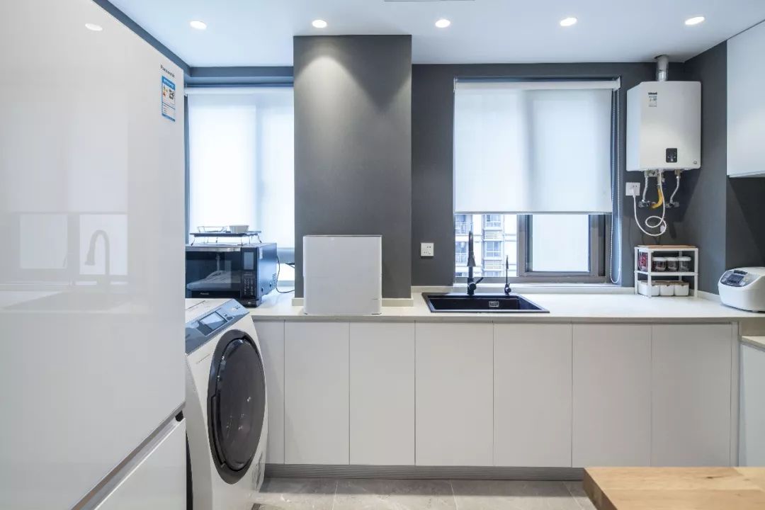 厨房是开放式的布局,L形的橱柜和洗衣机、冰箱紧凑的结合在一起,整体灰色搭配白色的柜子,让人感觉简洁而又轻松。