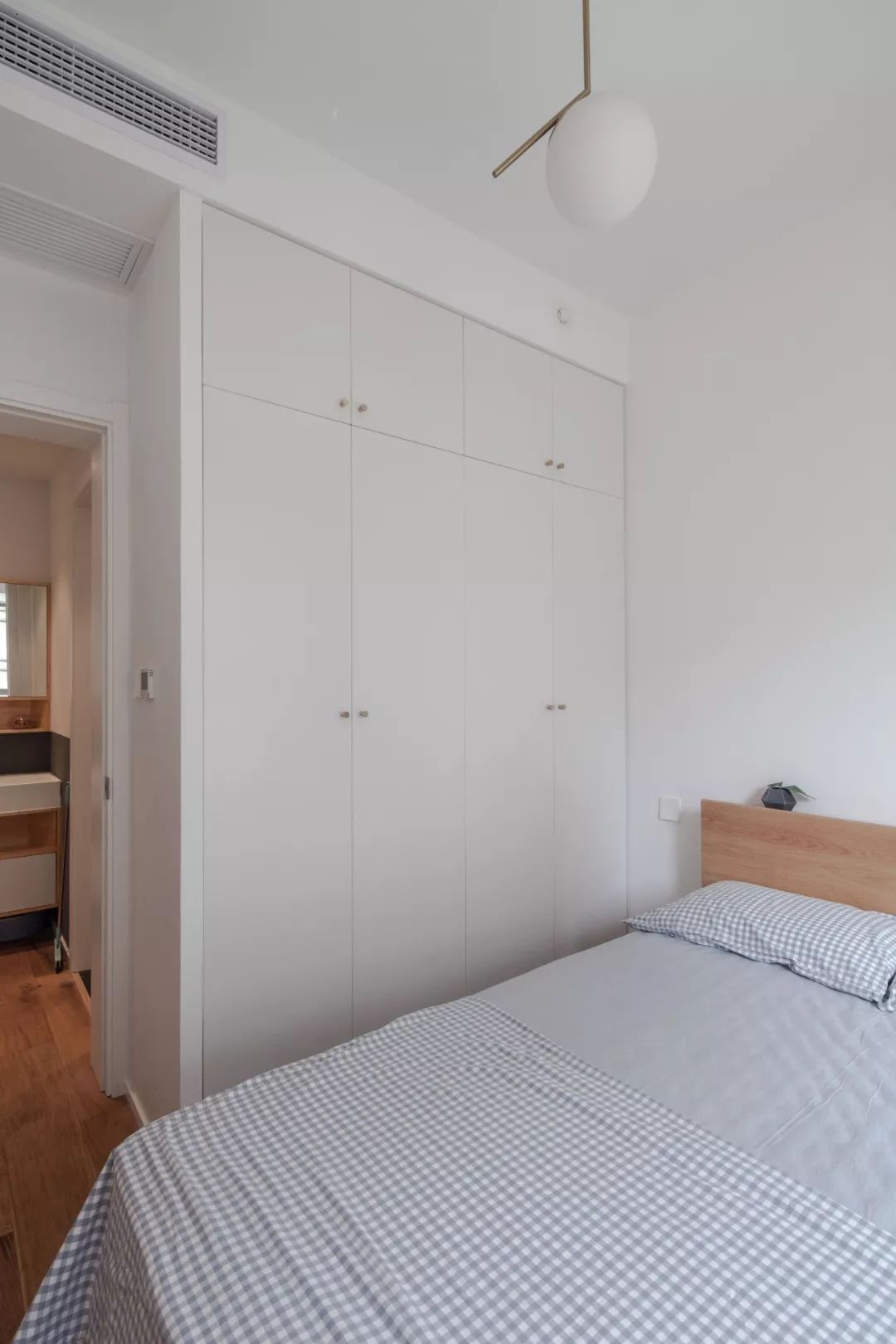 像儿童房内就没有摆放床头柜,衣柜和床之间留出部分空间,方便开关柜门和日常通行。儿童房外的就是卫生间的干区,洗手台移到了门外。