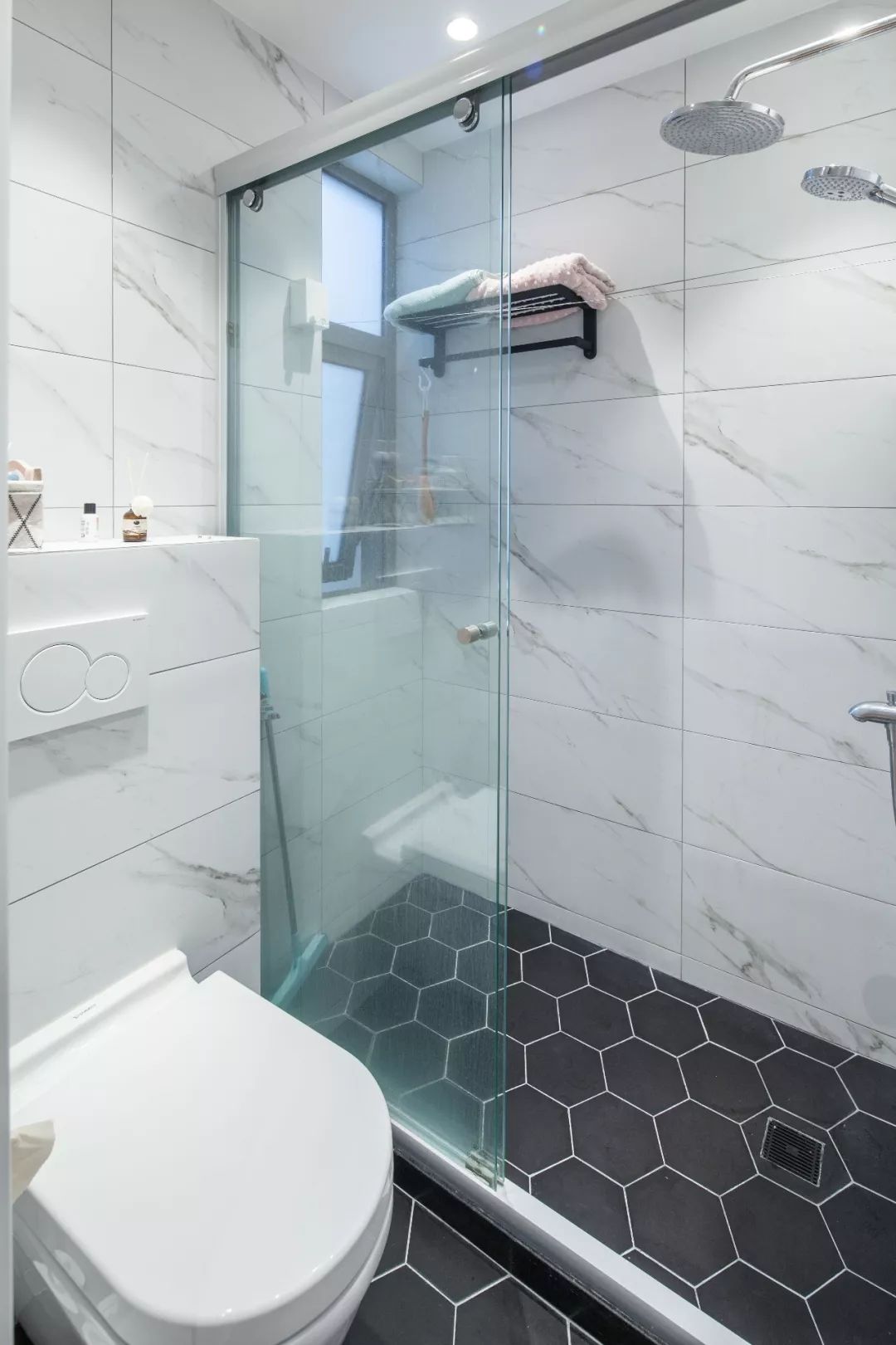 卫生间的内部也做了干湿分离,用一扇玻璃隔断门搭配挡水条来分隔马桶和淋浴区,黑色的六边砖搭配白色的大理石墙砖,让人感觉简约而又文艺。