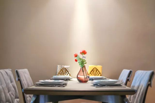 开放式的餐厅,直线条的长餐桌椅,简约又汇聚的光源就像小太阳,为整个就餐环境发光发热。餐椅套和沙发的颜色遥相呼应,陶质的餐具,沉稳的主色调上缀以明亮的花色,就餐时的心情也添了一丝趣味与生机。