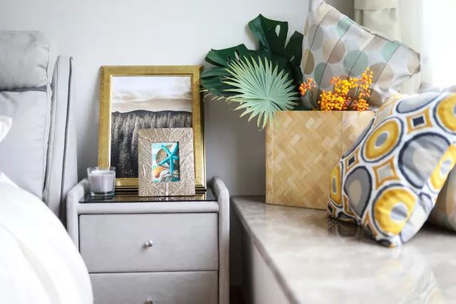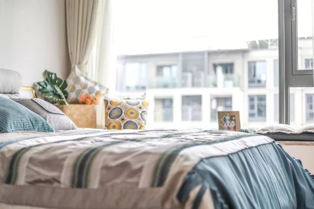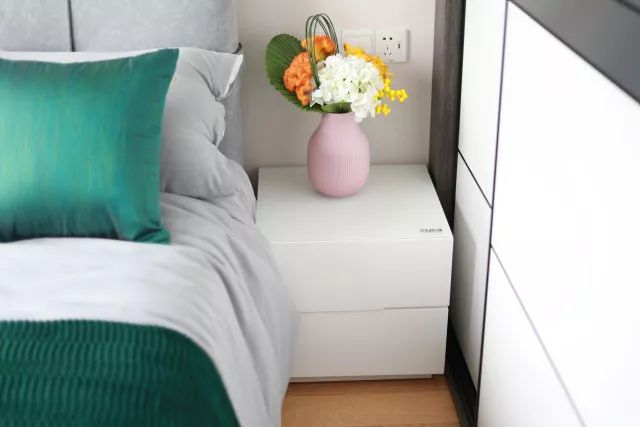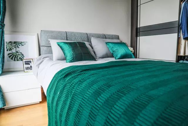 浅浅淡淡的绿色让次卧都耳目一新,绿色渐变床品和绿色热带植物挂画相互呼应,带来清爽温润的美意。
