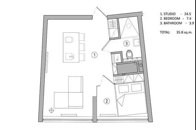 关注微信公众号:jiaxhx,学习更多小户型装修知识技巧齐家小菜今天分享的是一套套内实际面积36平米的极简风小户型单身公寓案例,房子的格局有些不够规整,设计师以白色为主,搭配原木与大理石元素来构造出一个简单而又舒适的小窝,细节上的点缀也让人感觉更加时尚。平面布置图从入户门走进这个家,就可以看到中岛