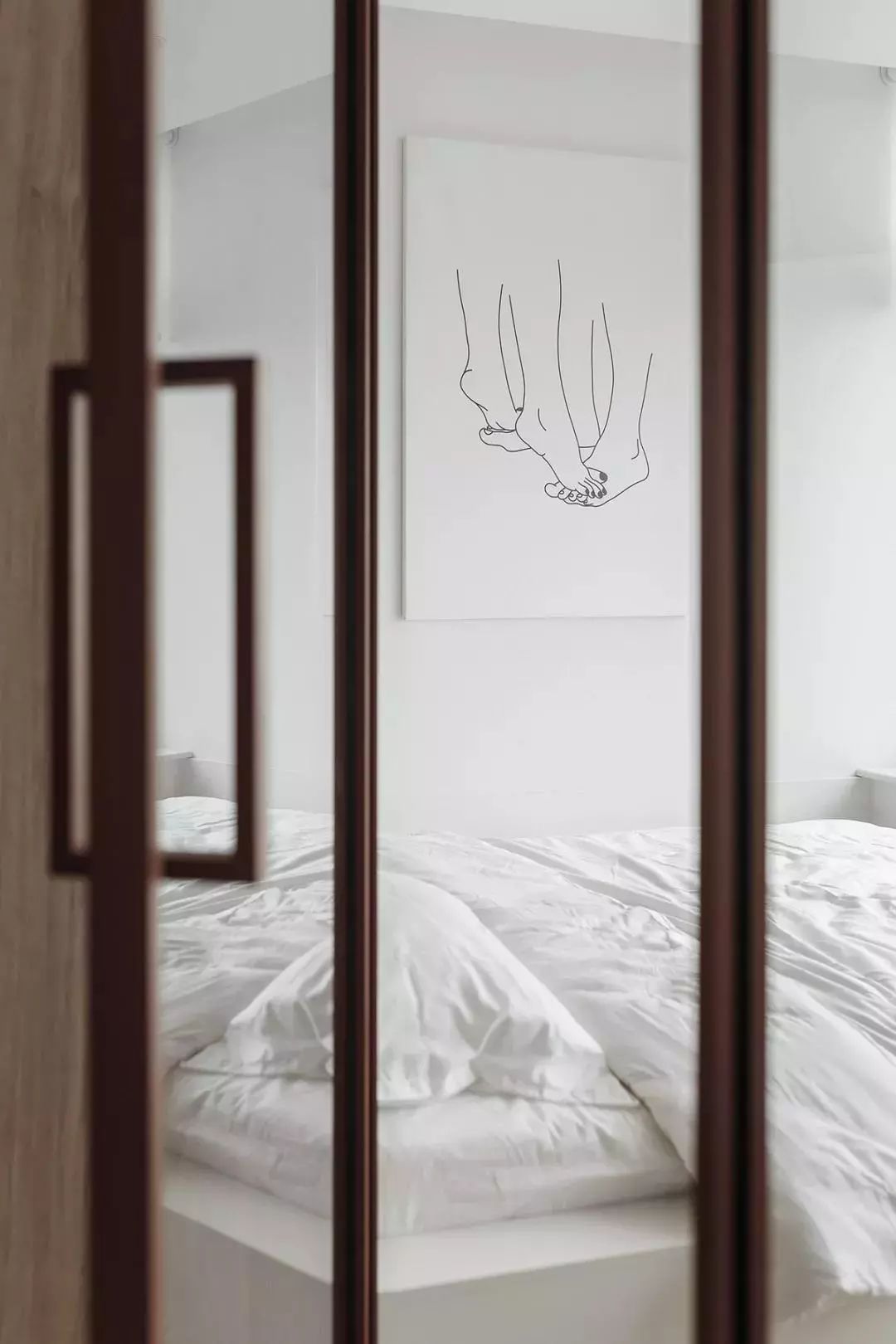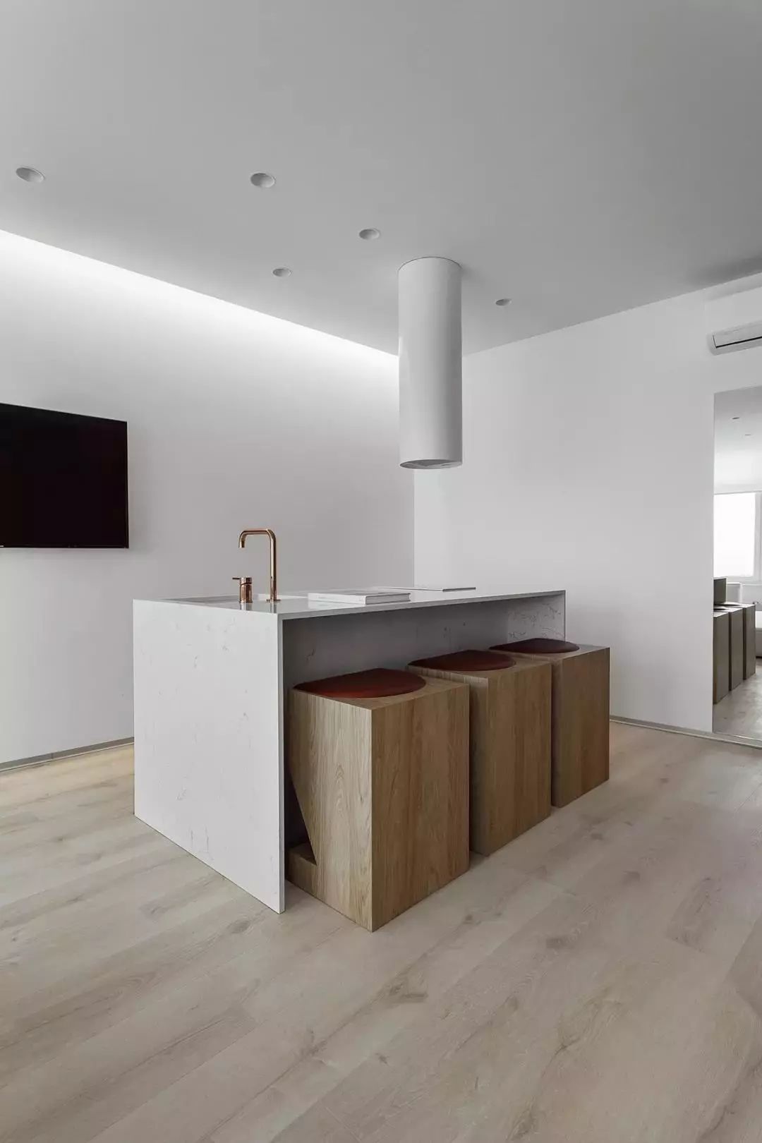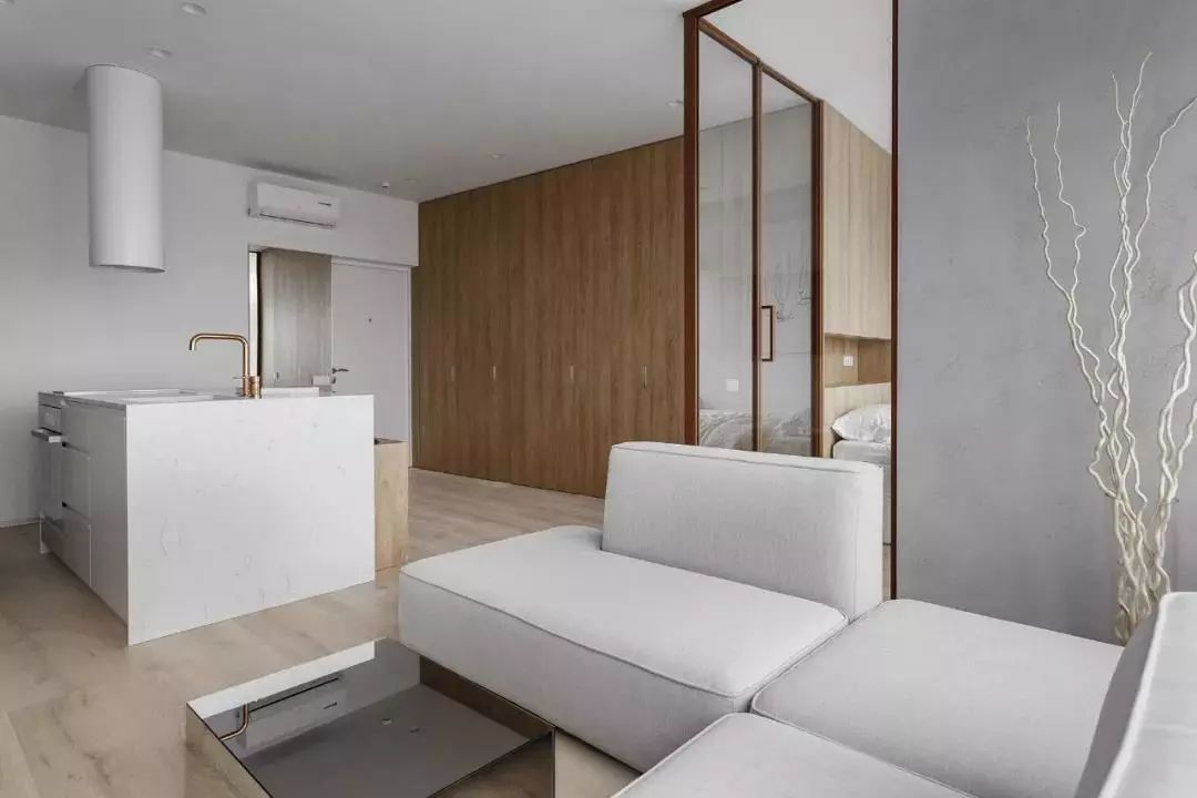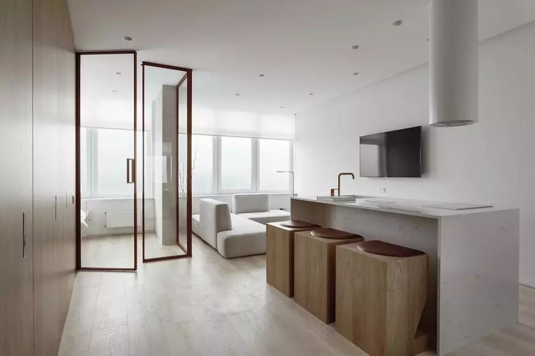 从入户门走进这个家,就可以看到中岛厨房和餐厅的结合、简洁的白色背景墙上挂着电视,卧室和客厅之间用玻璃门作为隔断。