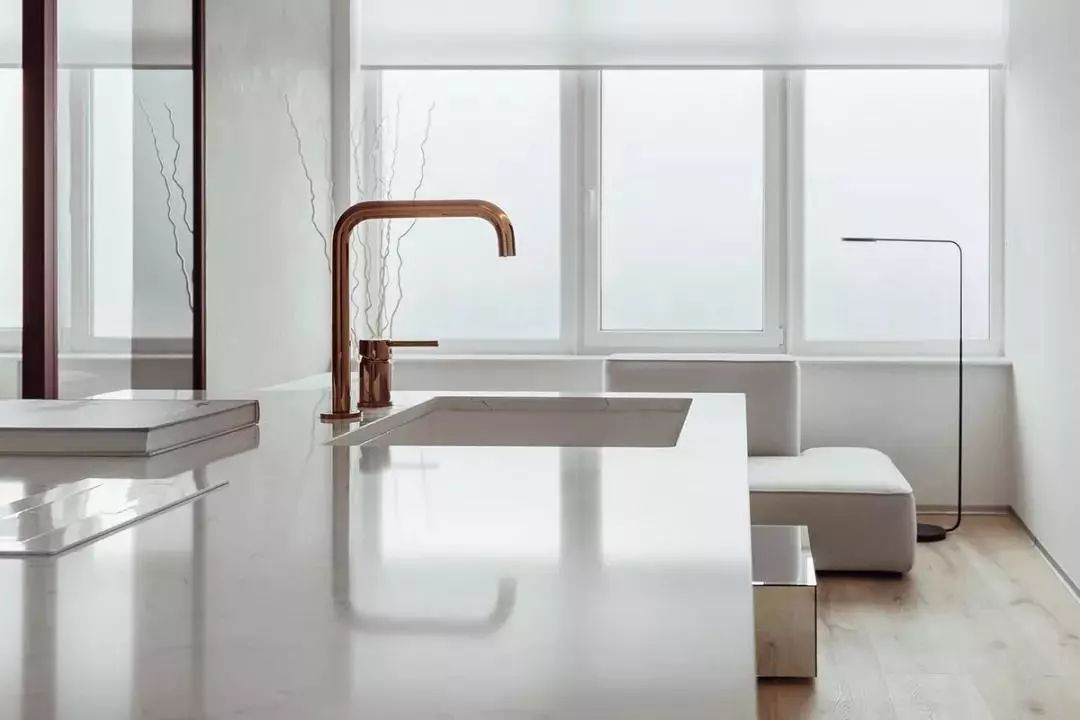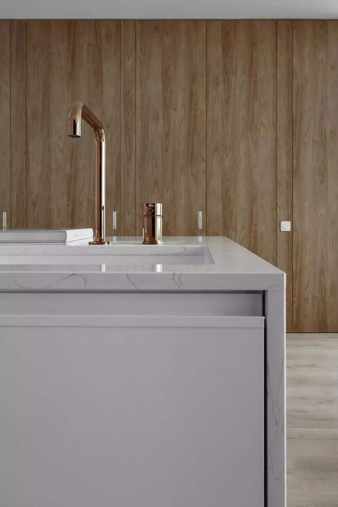 大理石的台面上点缀着一个铜质的水龙头,从细节上体现出屋主对于时尚、精致的追求,搭配整体极简的设计显得更为简洁大方。