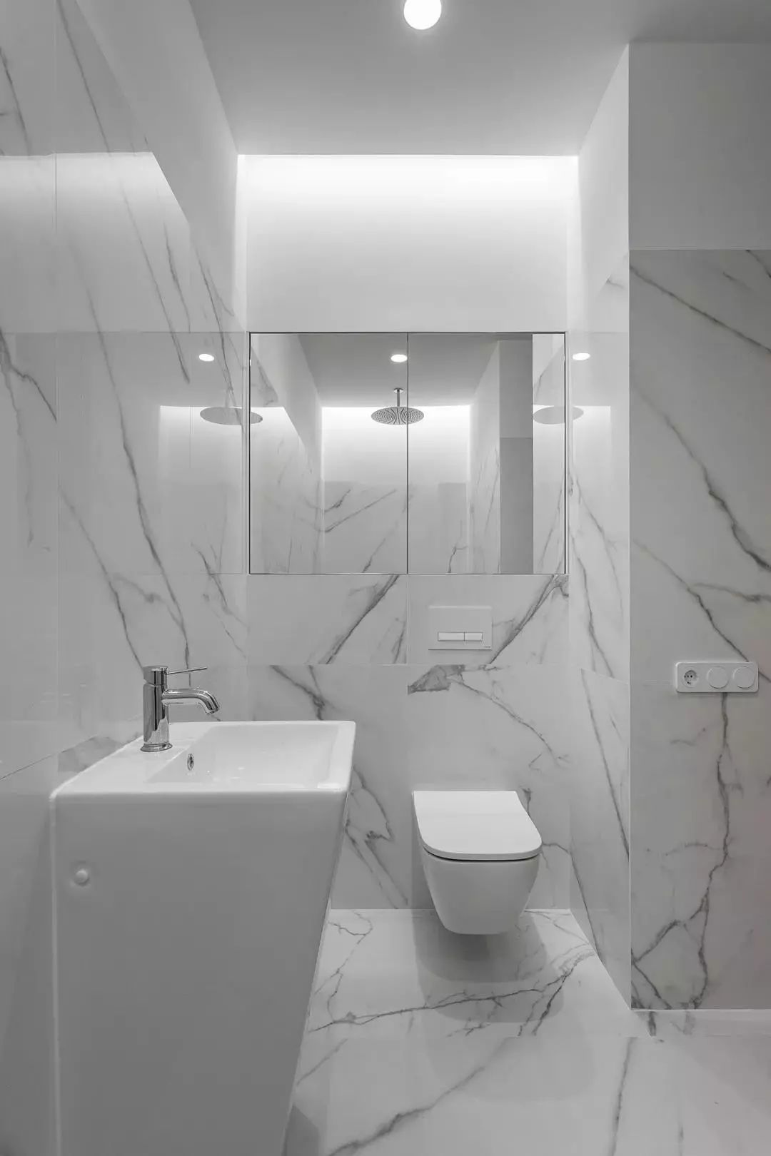 卫生间内部是选择了通铺白色大理石瓷砖的设计,把镜柜放在了马桶的上方,还加上藏光的设计,虽然是个暗卫,但也让人感觉非常宽敞明亮。