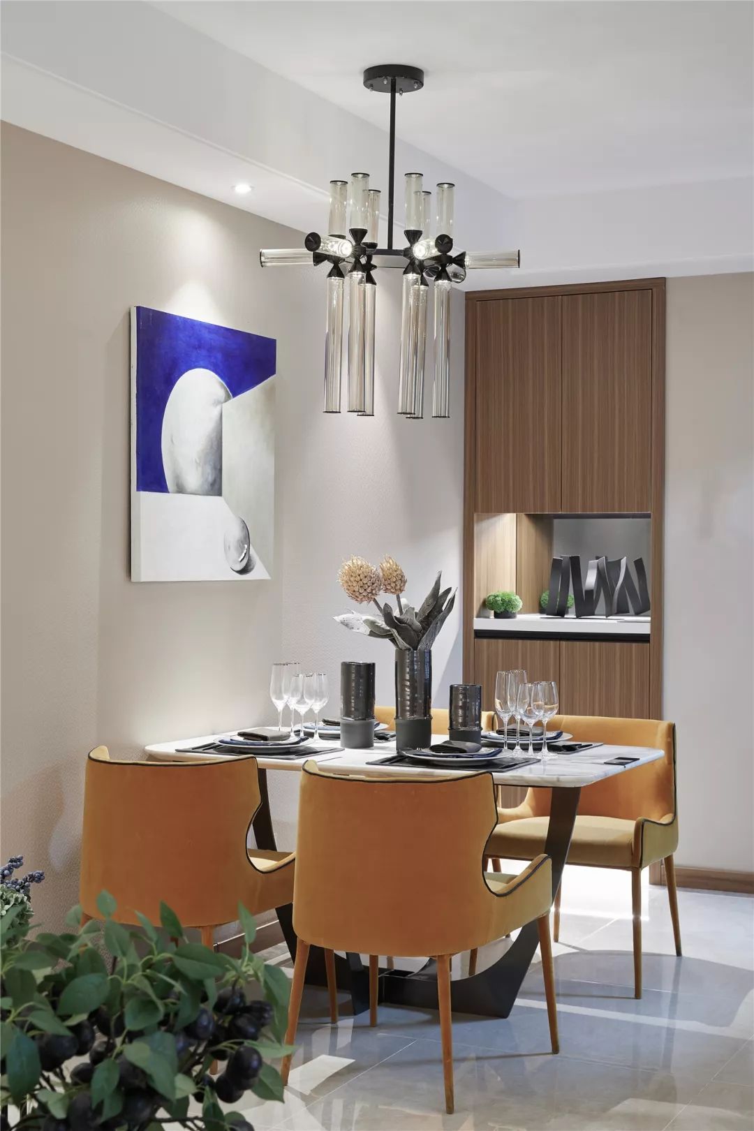 大理石的餐桌台面搭配底部创意的桌脚,橙黄色的布艺椅子让餐厅更加亮眼。侧方还有嵌入式的餐边柜、鞋柜,增强餐厅的实用性。