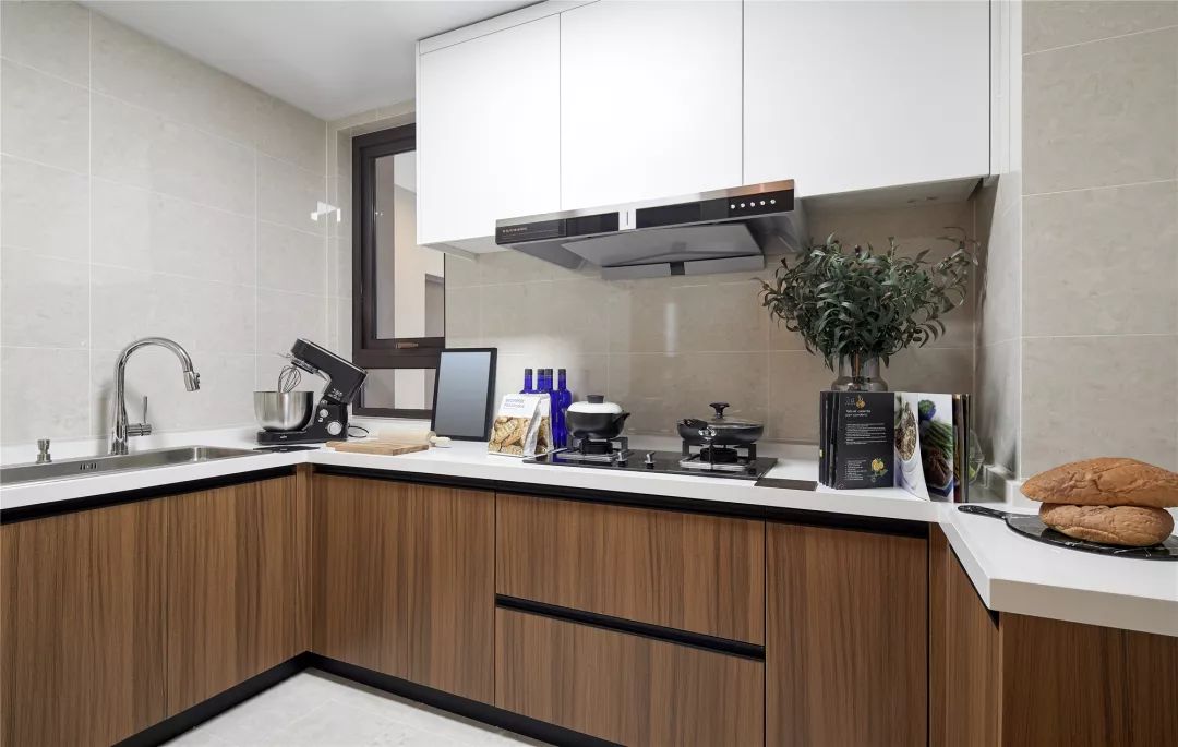 厨房的面积还是比较宽敞的,做了U字形的橱柜布局,水槽上方的墙面留空,可以避免柜子太满带来的压抑感。