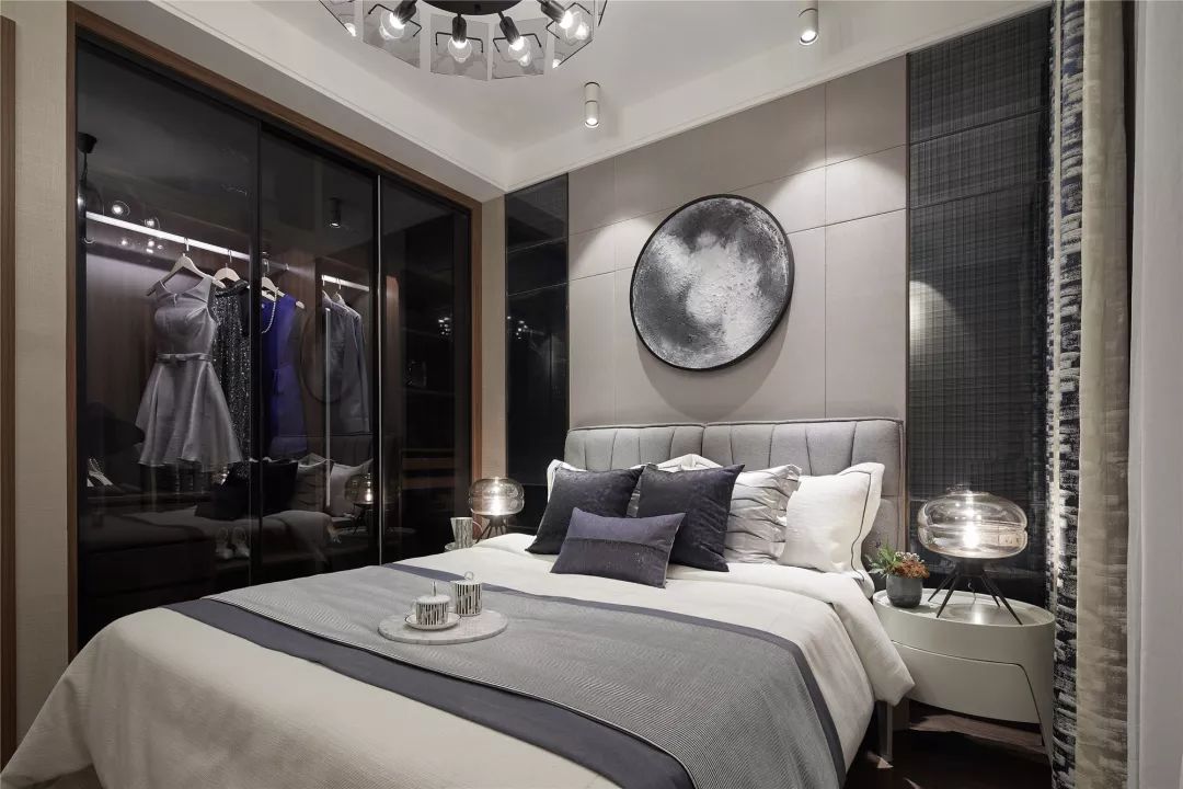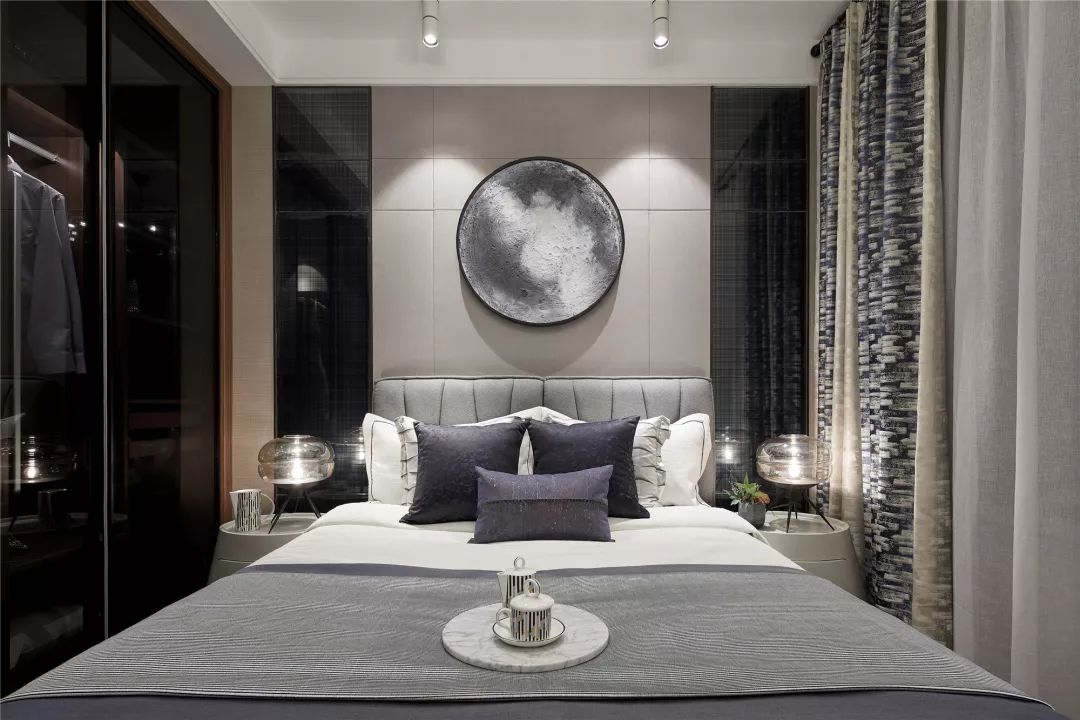 主卧室的床头背景墙两侧做了对称的黑玻设计,终究是一幅圆形的创意画,以黑色、灰色和素色为主的配色方案,让人感觉宁静而又素雅。